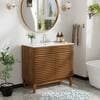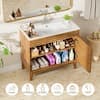 Grated panel design adds rustic charm to your bathroom. Made of MDF and particleboard for durability. Soft-close hinges ensure quiet operation