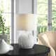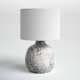 This accent lamp combines earthy tones and details textures with a concrete-like finish designed to draw the eye. The base is made from ceramic with a textured gray and white finish that sports intentional distressing for subtle vintage-inspired vibes. Up top, the cream-hued cotton drum shade adds a crisp contrast against the multi-textured look of the base. This table lamp accommodates a single LED-compatible 100W medium E26 bulb (not included) and measures 14.5" tall.