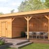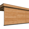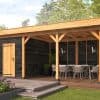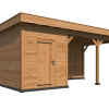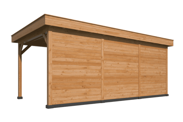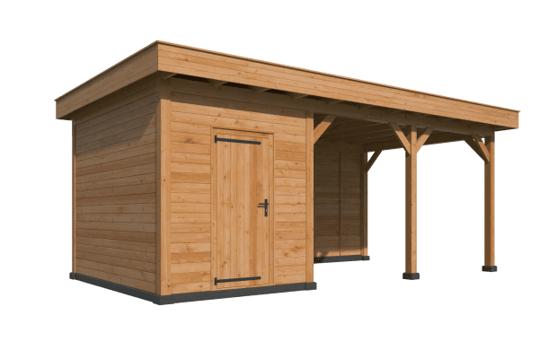 PLAT DAK OSLO L TYPE 7 Palen 14,5×14,5 cm Ringbalk 4,5×16 cm Liggers 4,5×14,5 cm Dakbeschot 1,8×16,5 cm Boeiplanken 2,8×26 cm Afdeklijsten 1,6×6,5 cm Doorloophoogte: 230 cm Onbehandeld, geschaafd, gedroogd, kernvrij, A-kwaliteit lariks/douglas. Inclusief enkele deur Inclusief opbouwbeschrijving en bevestigingsmaterialen. Inclusief EPDM dakbedekking en dakdoorvoer. Modulaire overkappingen Stel uw eigen overkapping, tuinhuis, carport, sauna, garage, kapschuur etc. samen met dit unieke modulaire systeem! Alle onderdelen worden op maat en voorgeboord geleverd. (uitgezonderd de wandplanken) U kunt eenvoudig uw basispakket verlengen door er een uitbreidingsset tussen te plaatsen. Deze kunt u desgewenst ook eenvoudig inkorten. Tevens zijn er talloze uitvoeringen te maken door middel van plaatsen van wanden en/of deuren en ramen. Alle modules zijn samengesteld uit A-kwaliteit geschaafd, gedroogd en kernvrij lariks/douglas hout en worden geleverd inclusief de benodigde bevestigingsmaterialen en een uitgebreide opbouwomschrijving.
