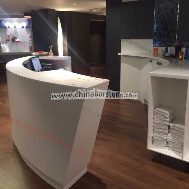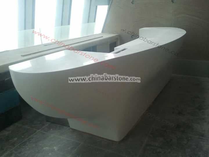 Reception Desk, Commercial Furniture, Office Furniture, Customized design and Customized production, Round, Semi-circle, Curved, I shape, L shape, and any custom shape, Acrylic solid surface, Lacquer wood, Glass, etc, More than 150 colors available, RGB LED, sink, faucet, cabinets, drawer, door, Matt(800-1000 grit) or High Glossy( 1500 grit), Free 3D drawing, Free sample, 10 years in Normal use, Pub, Nightclub, Cafe, Restaurant, Hotel, etc