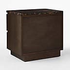 Oak nightstand by Caleb Zipperer defines the bedroom. Minimalist details like the plinth base and flat-front drawers sans hardware put the focus on the distinctive grain of oak veneer, highlighted by a dark walnut stain. The wood lends a natural warmth to the design while the cool black marble top offers a rich counterpoint. CB2 exclusive.