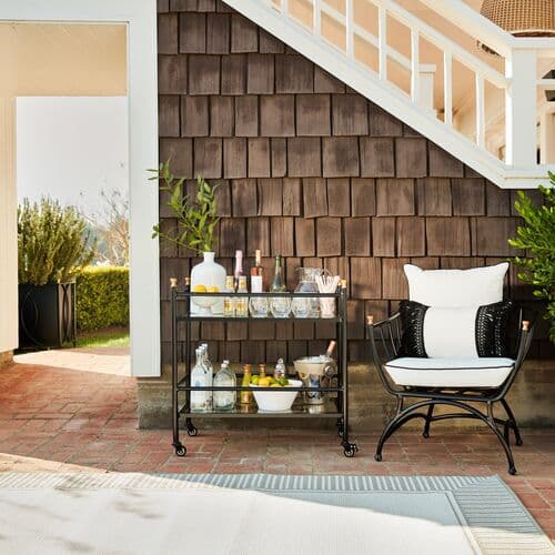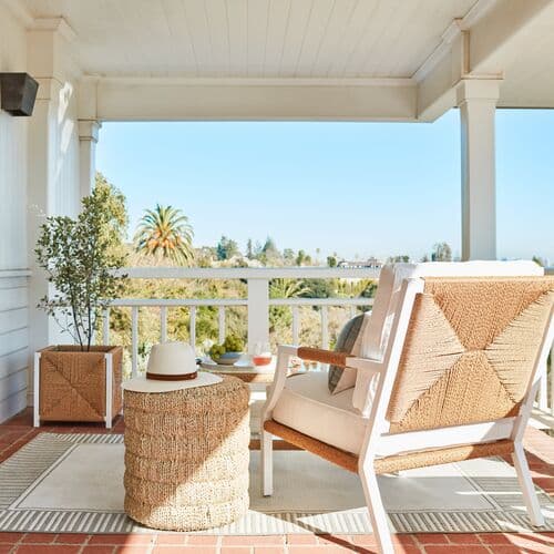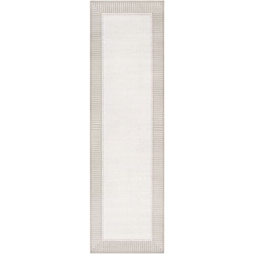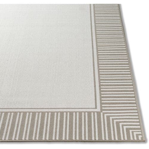 With a striped border, this neutral outdoor rug is crafted from durable polypropylene. This material is easy to clean, withstands the elements, and resists wear and tear. Suitable for porches or patios, it can also be used indoors to safeguard high-traffic flooring areas.