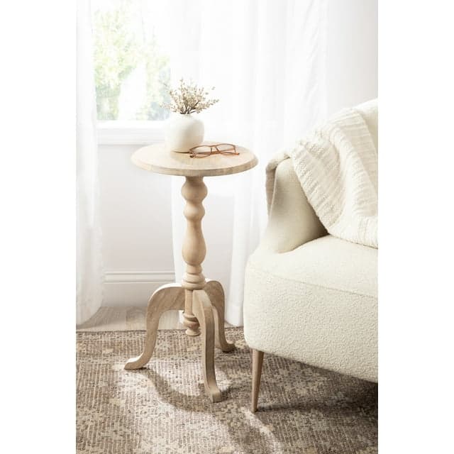 Introducing our beautifully crafted Tourneaux solid wood side table, the perfect addition to any living room, home office, or sunroom. Made from high-quality mango wood, this round table offers a stylish turned tripod base and a round surface to hold your drinks, plants, or any items you may need within reach. Measuring at 26 inches in height and 16 inches in diameter, this table is the perfect size to fit next to your favorite armchair or couch. The refined finish of the wood provides an elegant and timeless look that complements any decor style. Not only is this vintage end table functional and stylish, but it's also durable and long-lasting. The mango wood construction ensures that it can withstand regular use and will feature unique variations within the woodgrain based on its organic wood structure. Plus, its useful size makes it easy to move around and store when not in use. This versatile table is perfect for enjoying a relaxing evening at home or hosting a gathering with friends and family. The three-step assembly is quick and easy with no hardware needed. The instructions are clear and concise, making it a breeze to put together in just a few minutes.