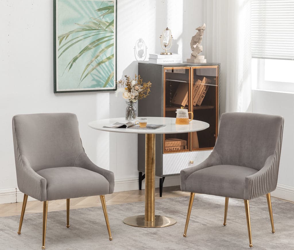Reliable Support: Golden metal legs of SEYNAR dining chairs are stable and durable, which don't rust and can disperse the stress area, bearing without shaking.Weight capacity hollds up to 250lbs, suitable all groups of people. Plastic foodpads of our dining room chairs make your floor from scratches. There is a zipper in the bottom of the chair, where the chairs legs are. Soft Velvet Fabric: Our chairs for dining room are made of high-quality velvet, skin-friendly and breathable, suitable for all seasons. The cushion and backrest of our tufted velvet chairs are filled with high-density resilient sponge, not easy to collapse. Ergonomic Design: The backrest of the upholstered dining table chairs has a little inclination that matches the curve of the body well, bringing your back and waist comfort. Modern Design: The mid-century modern dining chair with sloped arm and stripe in the back is elegant and fashionable. The simple and sleek design works with a range of styles, making the tufted chairs set of 2 compatible with anywhere in your house, like kitchen, dining room and living room. Easy to Move & East to Assemble: With the pulling rod in the back, you can move the velvet dining chairs with less effort. Necessary parts and installation instruction comes with the fabric dining chairs, which is easy to install. If you have any questions with the assembly, please feel free to contact us.