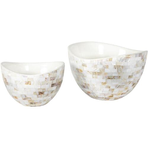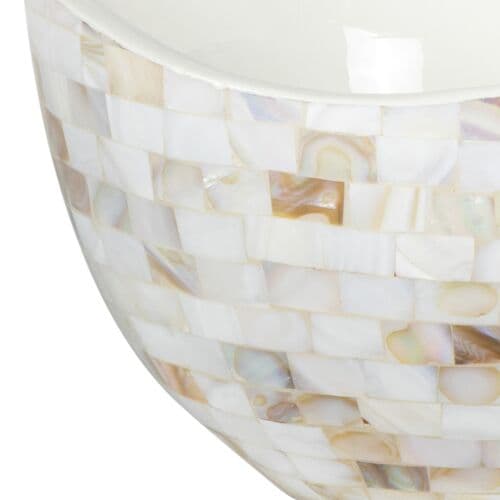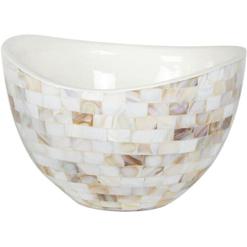 A colorful arrangement of mother of pearl pieces decorates the Jake Bowl, offering a captivating play of light with its reflective surfaces and opalescent sheen. Perfect for various surfaces or as a stylish accent, the Jake Bowl adds a touch of refined elegance and charm to any decor, beautifully enhancing the ambiance of your space.