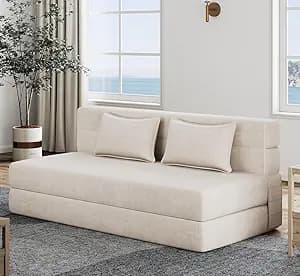 Luoxiao Folding Sofa Bed Queen with 2 Pillows, Portable Foldable Sofa Bed for Travel, Camping, Guest, Trifold Sofa Sleeper with Breathable & Washable Cover, Convertible and Easy to Storage,Off White