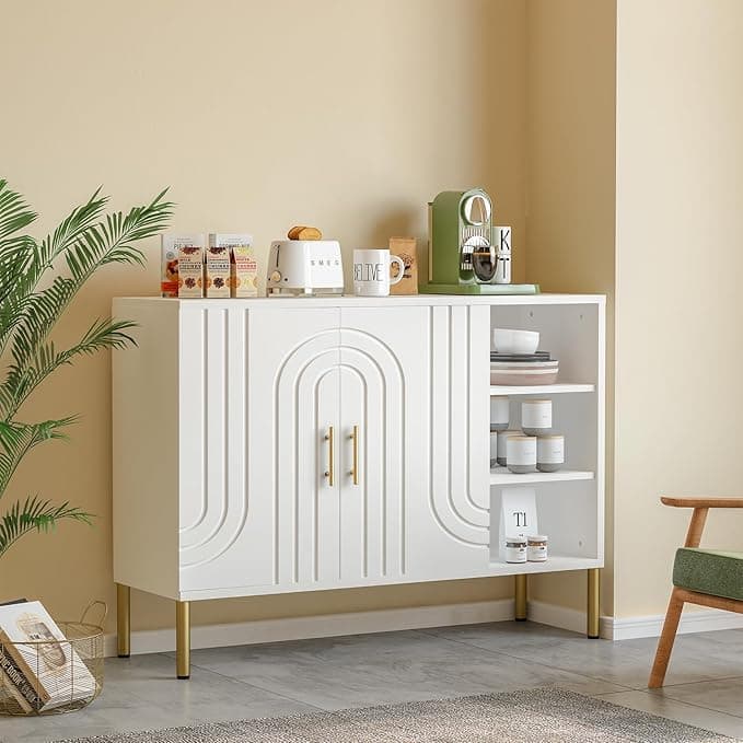 🌟【Design Elegante】Questo mobile presenta curve eleganti e motivi strutturati che ne esaltano l'estetica, rendendolo un punto focale straordinario in qualsiasi stanza. Il bel colore crema lo rende elegante e accogliente. ✨【Costruzione Durevole】 Realizzato con materiali spessi e di alta qualità. Ha una capacità di carico fino a 60 kg, assicurando che possa facilmente sopportare carichi pesanti e l'uso quotidiano. 😉【Ampio Spazio di Stoccaggio】Con una generosa capacità di stoccaggio, offre molto spazio per organizzare ed esporre i vostri oggetti essenziali, rendendola perfetta per tenere in ordine il vostro spazio. Le dimensioni di questa credenza sono 35 x 110 x 82 cm. ⭐【Uso Versatile】 Progettato per completare vari ambienti, questo mobile è ideale per il soggiorno, la zona pranzo o la camera da letto, adattandosi perfettamente al design della casa. Trasformate il vostro spazio senza sforzo e utilizzatelo in base alle vostre esigenze. 💖【Dettagli squisiti】 Le maniglie e le gambe dorate del mobile aggiungono un tocco di eleganza e raffinatezza alla credenza. Questa attenzione ai dettagli migliora il suo fascino estetico complessivo, rendendola un pezzo forte in qualsiasi stanza.