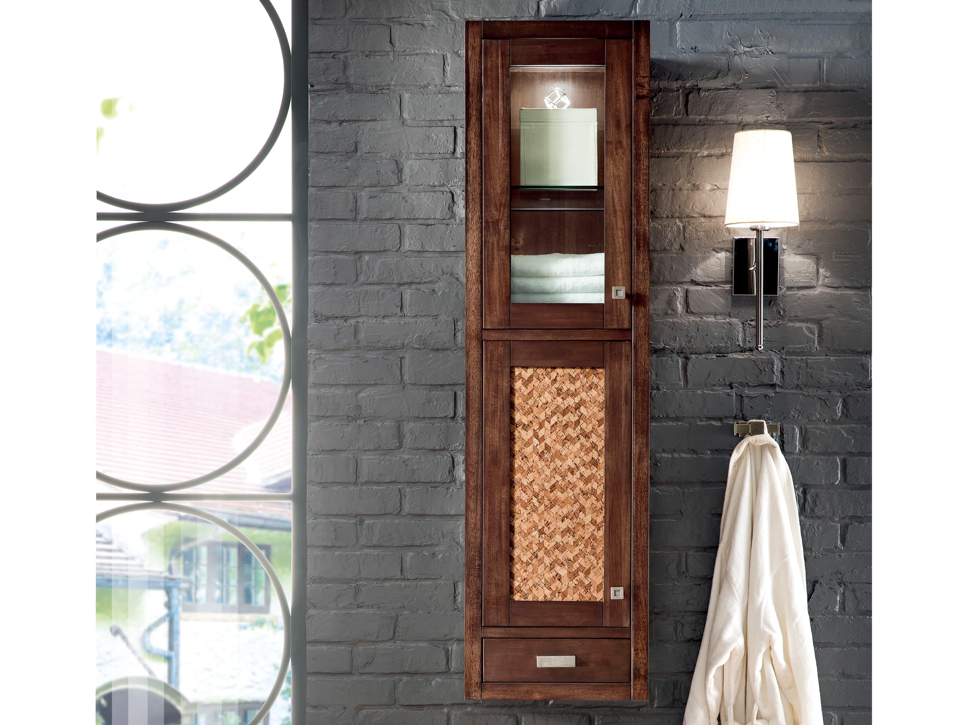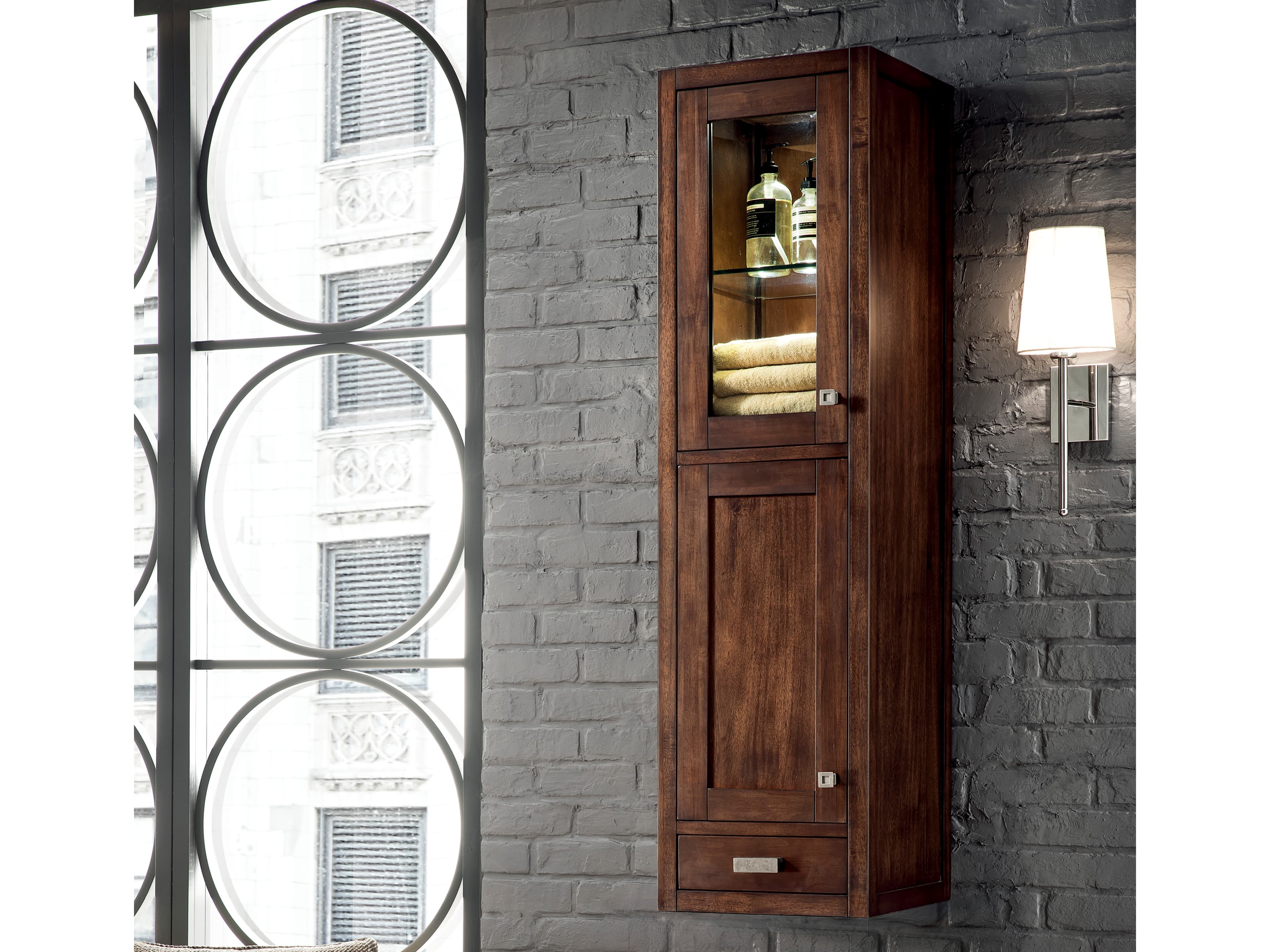 The Addison Collection 15-in. Grand Tower Hutch Left by James Martin Vanities comes in a mid-century finish on parawood giving you a fresh take on Shaker-inspired design with a look of luxury. Handcrafted and gender-neutral, it fits effortlessly into modern or transitional rooms. This versatile tower shows off its elegant style with its beautifully open glass top area for which you can use for storage or display purposes. The Shaker touch comes from the sides and door. The reversible doors that are found on each of the vanities is also a trait you will find on the towers. Each of the doors feature soft close door hinges, these hinges have dual adjustments (up and down, forward and backwards) to allow for alignment adjustments after the cabinet has been installed. The body of the cabinet is made of solid hardwood and sturdy panels of MDF. Interior shelves are both adjustable (and removable), each shelf is made from thick multi-layered plywood (except for glass shelves) faced with stain grade birch veneers. All cabinet interiors and exteriors are sealed with moisture and UV resistant finishes. Each cabinet features touch LED lighting on the glass part of the hutch for use when displaying your mementos. FEATURES* Bring the simplicity of Shaker-inspired design to your bath with the fully modular Addison Collection by James Martin Vanities. Handcrafted of solid parawood with a hand-applied finish. Each piece is finished inside and out for stand-alone application. Addison's slim, strong lines will offer a substantial look and feel to any room as well as work with a wide variety of different decors. Square legs raise the cabinet to generous toe-kick space. This elegant modular collection comes beautifully hand-finished in two incredible finishes: a rich, warm mid-century acacia color or a crisp, clean glossy white color and is accented with burnished nickel hardware. For the ultimate in versatility, door panels reverse to textural cork in an elegant herringbone pattern giving you two looks in one. The Addison Collection harmoniously blends the best of both contemporary and transitional looks evoking a sense of solace and relaxation * Adjustable shelves provide a sturdy storage solution * Parawood is durable enough to wIt'stand the test of time * Easy to clean and maintain * Everything you need for easy, reliable installation is included * Beautiful simplistic design that pairs seamlessly with a wide variety of different decors * All cabinet interiors and exteriors are sealed with moisture and UV resistant finishes