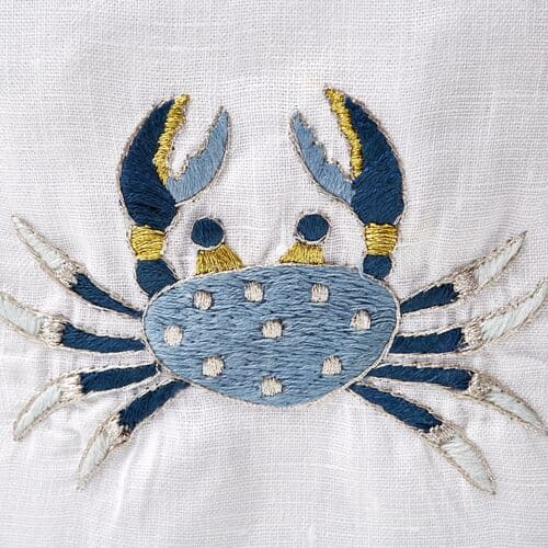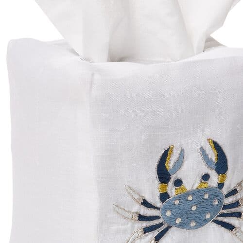 Exclusive to One Kings Lane, this tissue box cover is crafted from crisp white linen and features a hand-embroidered blue crab design.