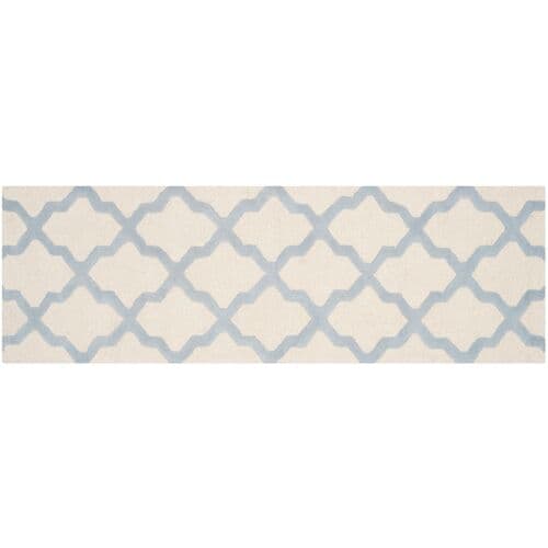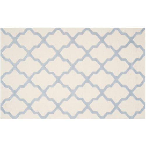 Suitable for various decor styles, this wool rug showcases a Moroccan-inspired pattern in light blue against a neutral ivory backdrop. Using a rug pad is advised to prolong the rug's life and ensure it stays firmly in place.