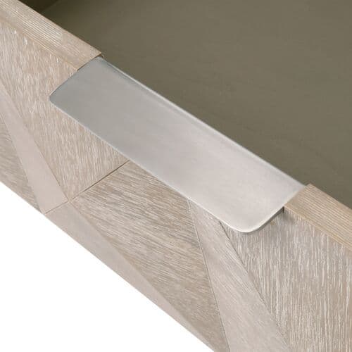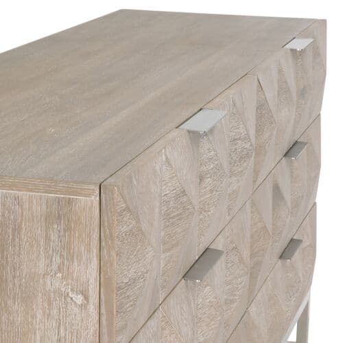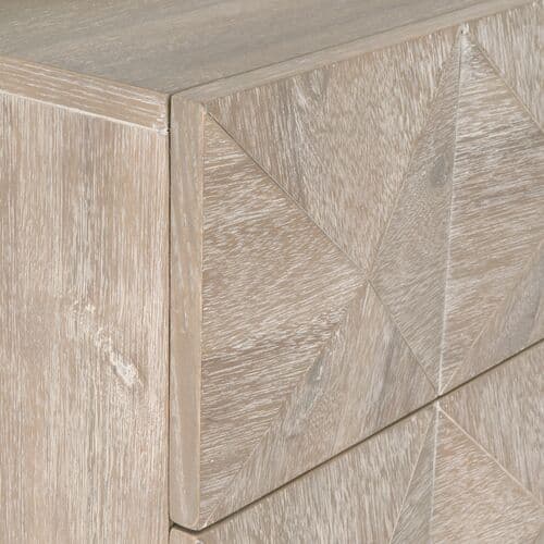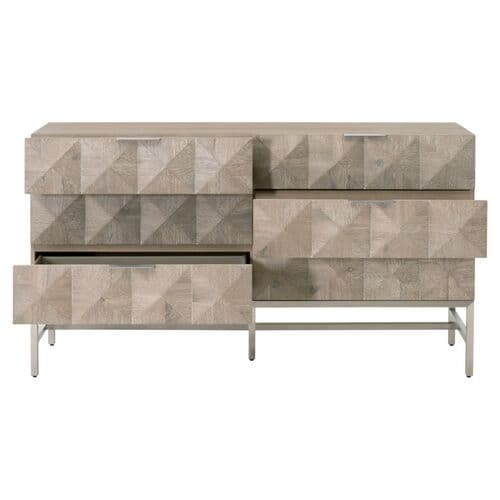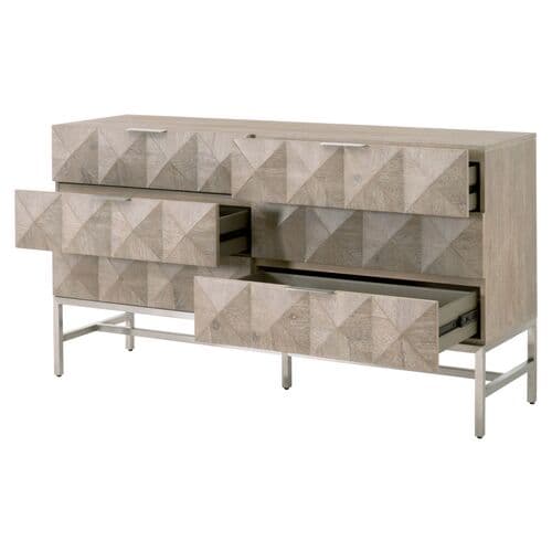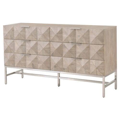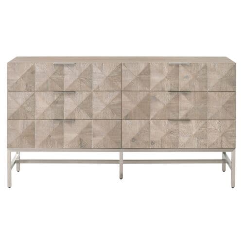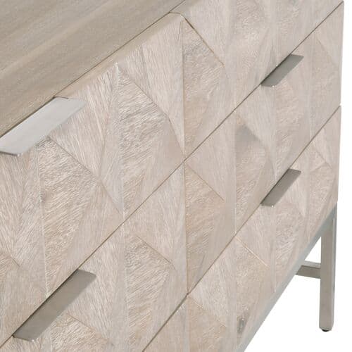 Six drawer fronts feature raised diamond panels, highlighted by a sandblasted finish to enhance the acacia's vibrant grain. The legs have a brushed finish that matches the minimalist drawer pulls for a cohesive look.