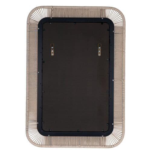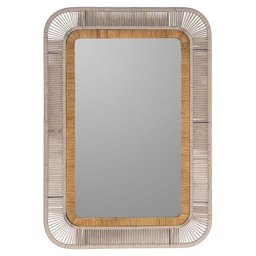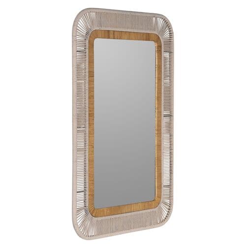 The frame of this wall mirror combines taupe weave with slender honey-finished wood bands, adding subtle tonal and textural contrast that captures attention. Elegance is enhanced by rounded corners.