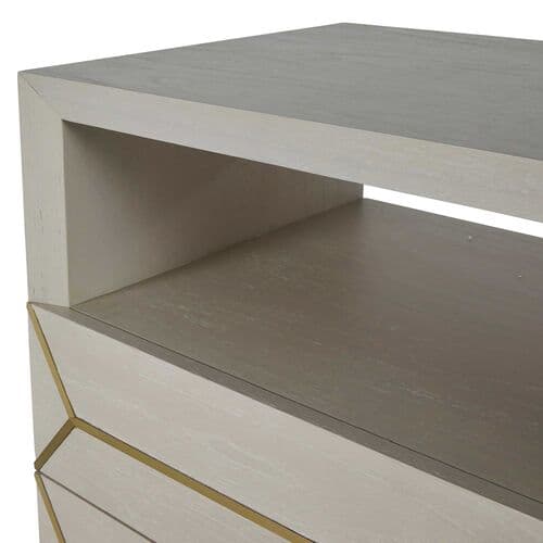 The Whitley nightstand features a tall, elegant design with slim brass legs and a white finish. It offers plenty of drawer space and a convenient open shelf, making it an ideal addition beside your bed.