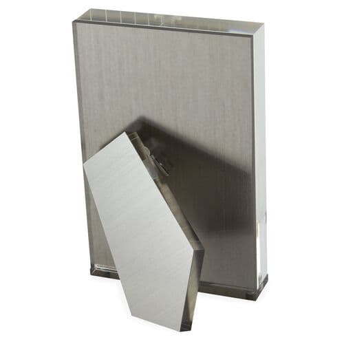 Perfect for showcasing a treasured photograph, the frame is made of clear acrylic and features a silver base with a magnetic closure.