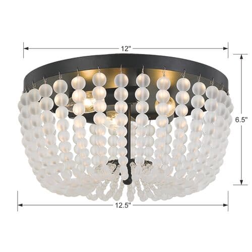 This flush mount is adorned with hundreds of hand-cut frosted crystal beads and features a sturdy steel construction with a hand-painted matte black finish. It is a hardwired fixture.