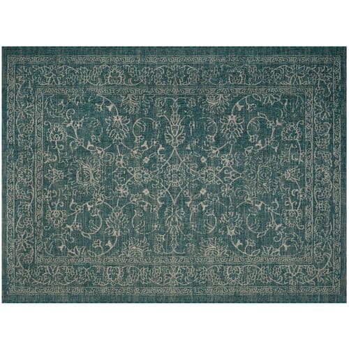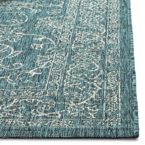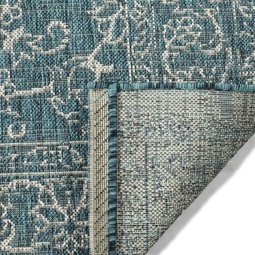 Featuring a traditional pattern updated with a turquoise backdrop, this outdoor rug is crafted from durable polypropylene, a material known for its resilience against elements and ease of cleaning. Ideal for patio use, it also suits indoor spaces to protect floors in busy areas. A rug pad is suggested to keep it firmly in place.