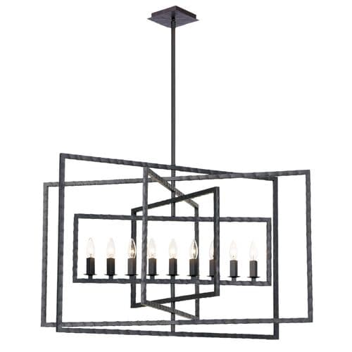 This chandelier presents a structured yet open design made from iron with a geometric shape and antiqued gold finish. It requires hardwiring.