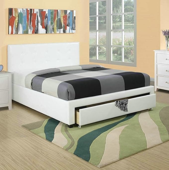 Wisk away your evening with this bedframe that features a faux leather upholstered bedframe with button tufting on the headboard and an underdrawer for extra storage. Compliment your bedroom space decor with a matching nightstand, mirror, and dresser.