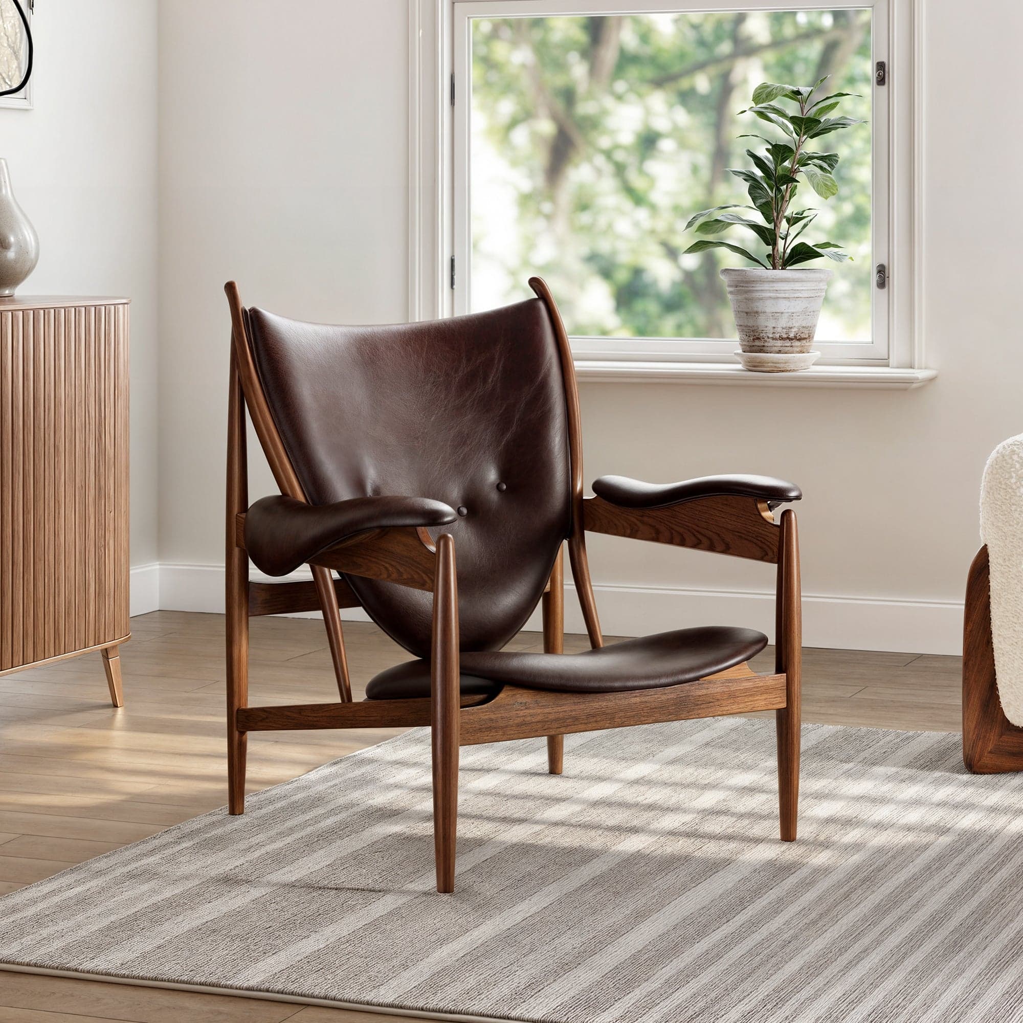 Featuring a refined design and comfortable seat cushions, this lounge chair features fine leather and durable wood for superior comfort. Its standout feature is mid-century charm combined with modern comfort, adding sophistication and elegance to your furnishing.
