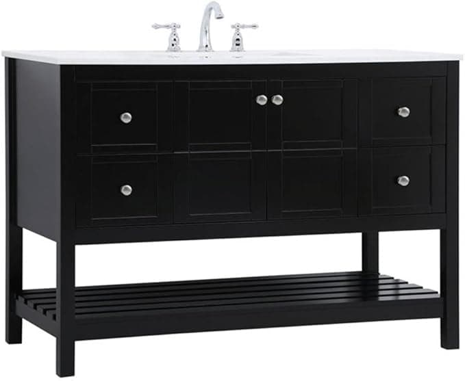 The subtle beauty of the Theo collection 48" vanity in a black finish exudes comfortable luxury. Its modern, yet traditional beauty will surely dress up your bathroom or powder room without any fuss. The white stone countertop and porcelain undermount sink shows quiet opulence, and the legs support upright without fail. Brushed Nickel hardware complements the trendy black finish, with pulls adorning the two cabinet doors and four drawers, showcasing ample storage space within. Slated shelf allows for additional space to organize your towels.