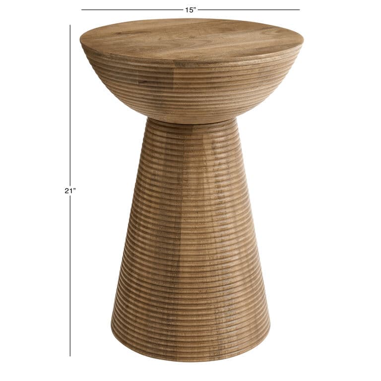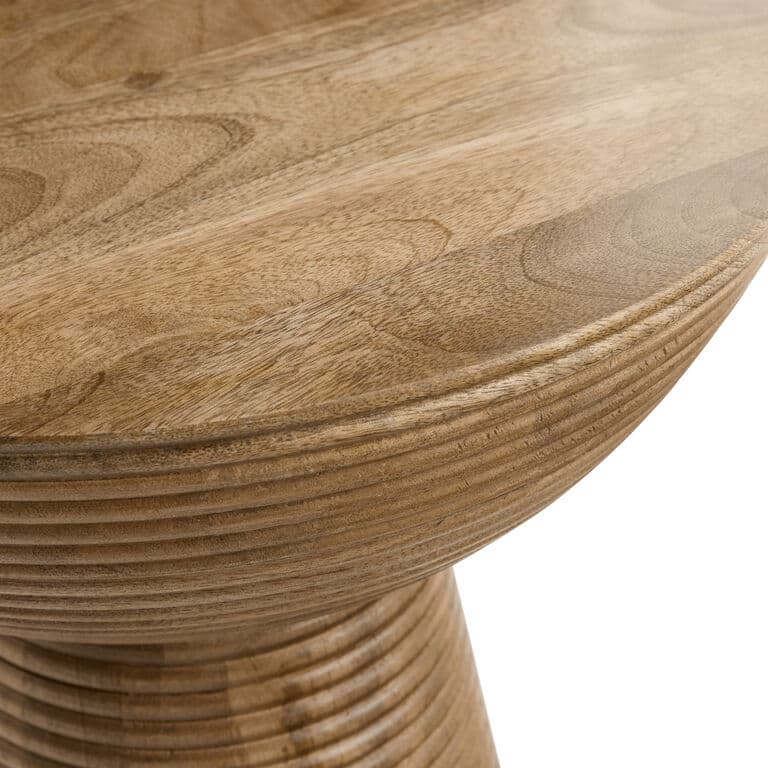 A fluted texture rings the conical pedestal and wide bowl of our Panaji wood end table, a tactile design that defines its drum-shaped silhouette. The horizontal ribbing of its sculptural base contrasts beautifully with a smooth surface. Crafted of natural mango wood, this accent table features organic variations in grain pattern and hue that enrich its unique visual aesthetic. This contemporary drum table suits any decor in rooms of all sizes.