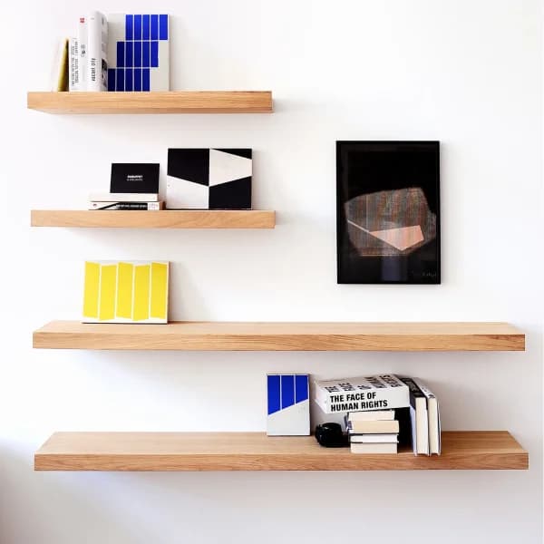 This elegant wall shelf, made of European oak, is the perfect solution for extra shelving needs. Featuring simple, clean lines, these shelves can be attached to the wall by aligning or stacking them, depending on the combination you prefer. Supplied with a stainless steel recessed bracket for easy installation.
