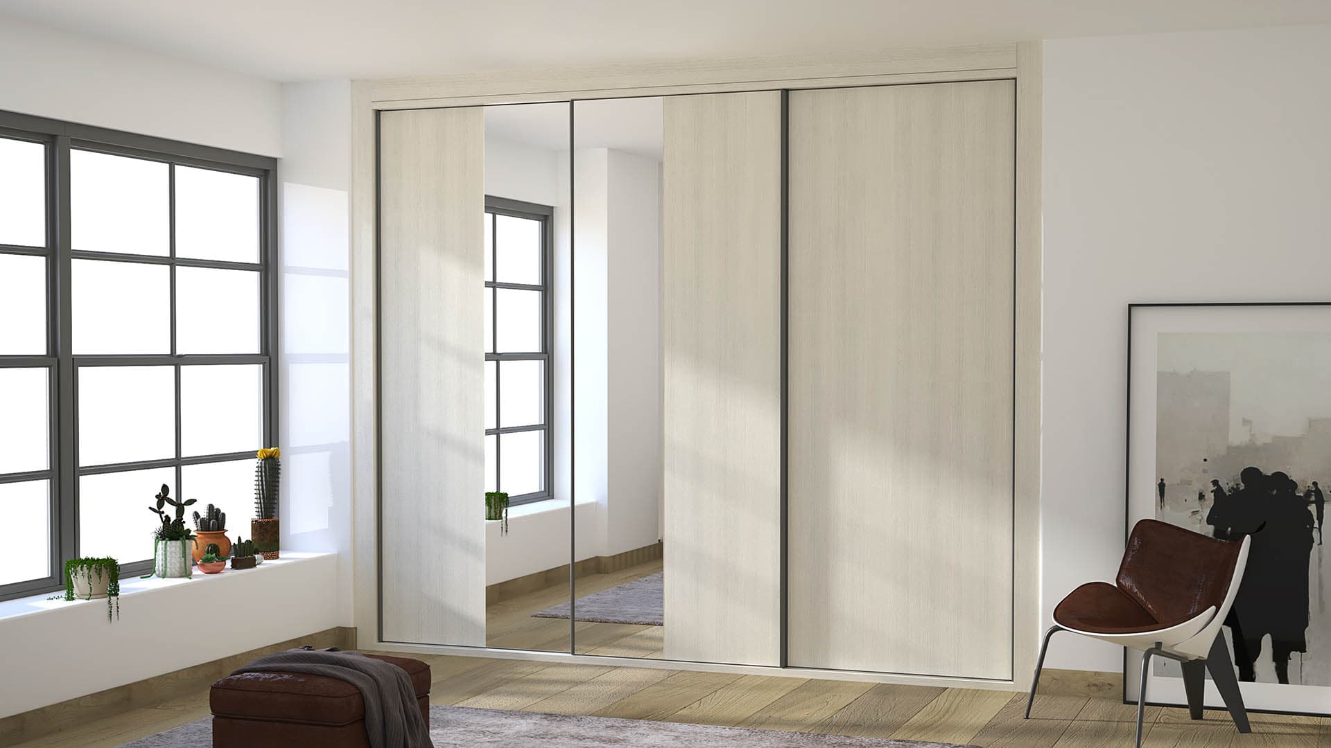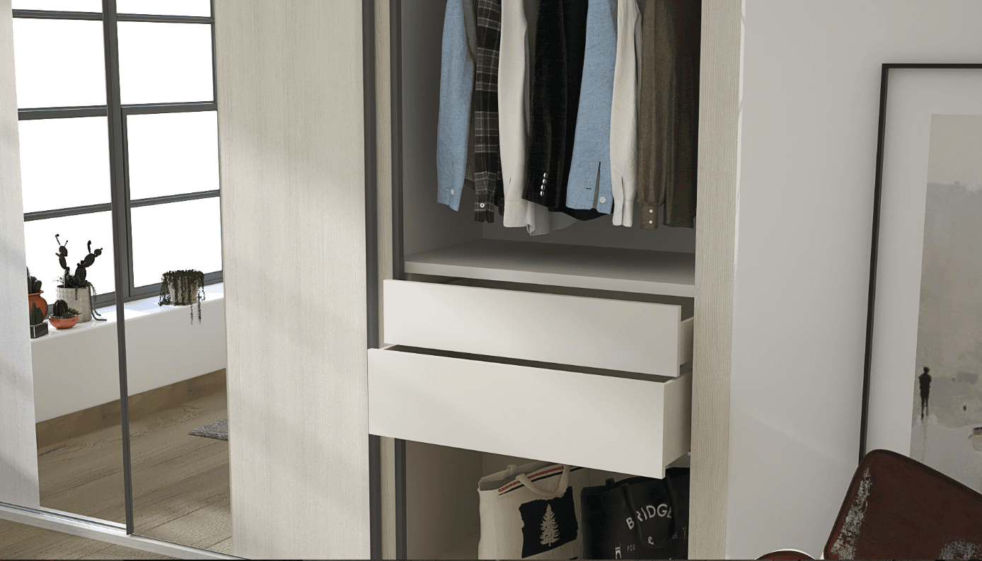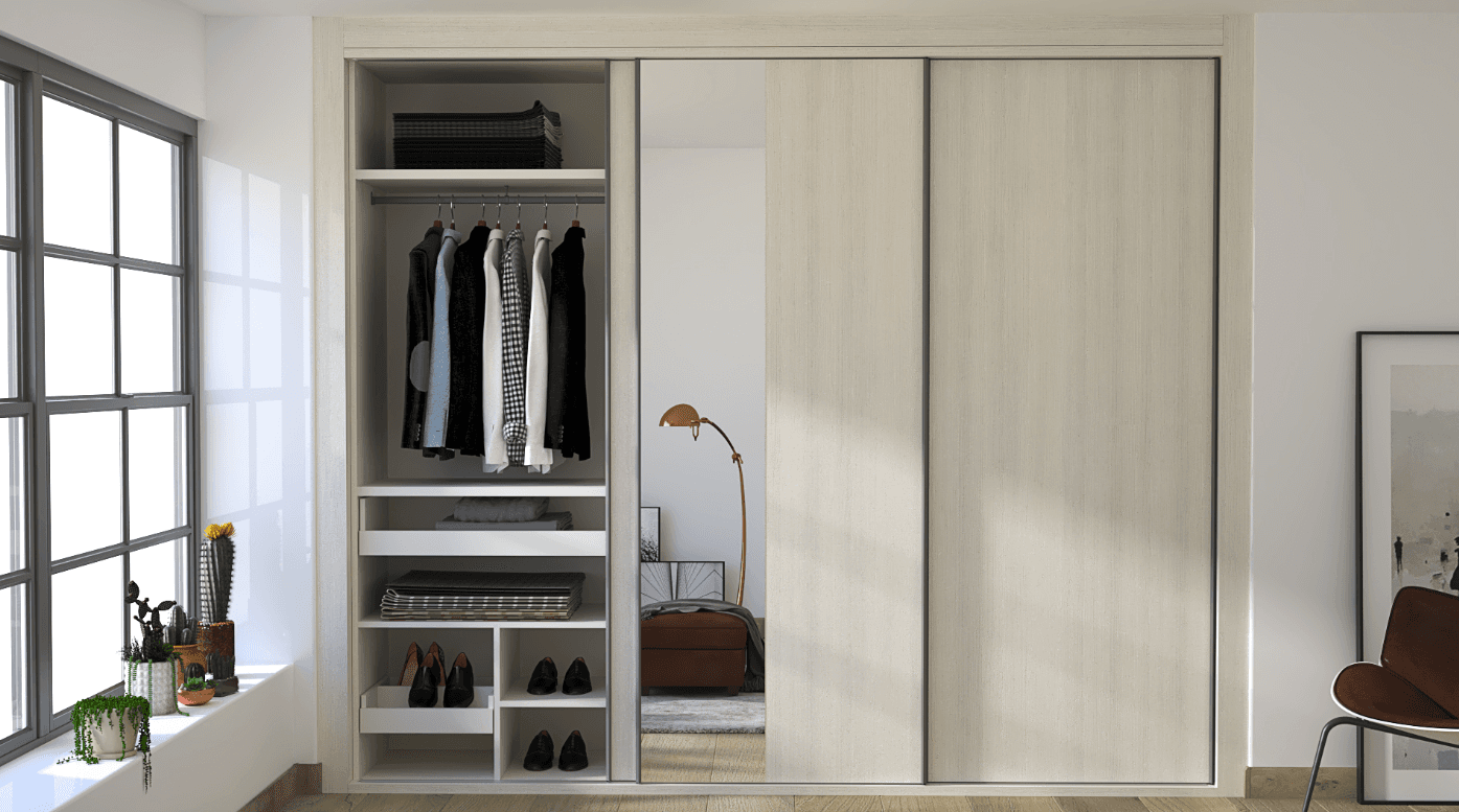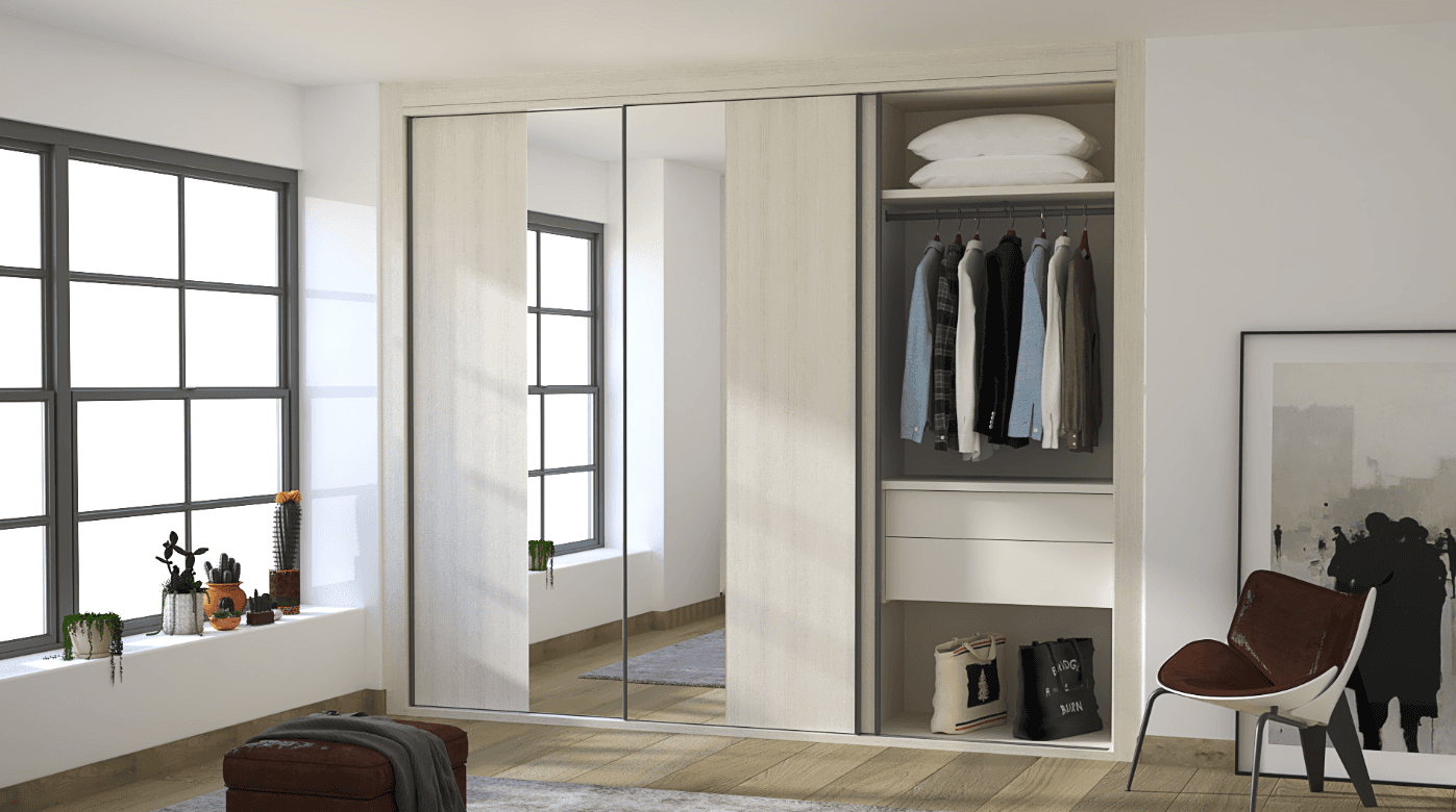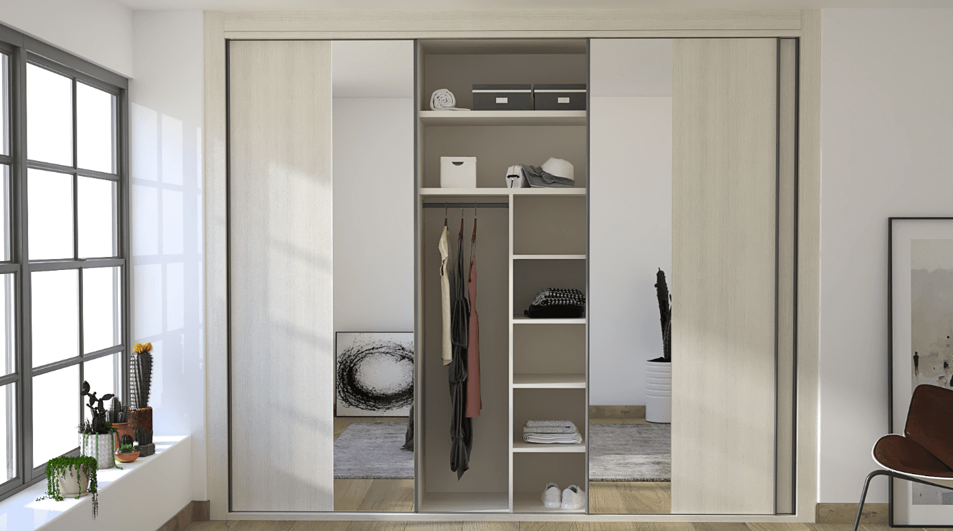 Collection Rosalía Built-in Wall Sliding Door Wardrobe. The Collection Rosalía epitomizes contemporary elegance and smart storage solutions with its subtle Gris Coco body, complemented by fronts in Pino Cervino and a unique 50/50 split of wood and mirror on two of its doors. This 3-sliding door wardrobe, designed to be built into a wall, offers a seamless and stylish approach to bedroom storage.