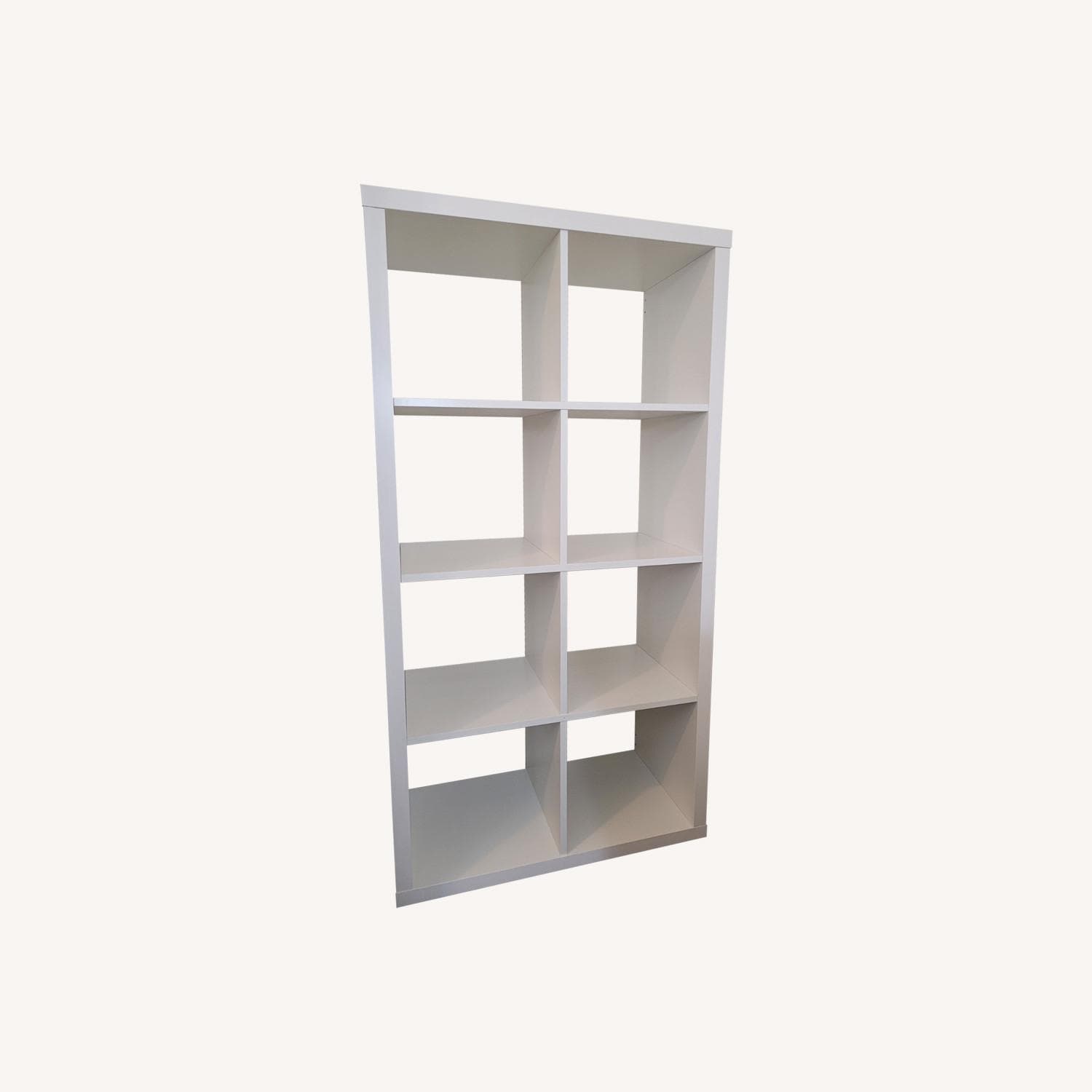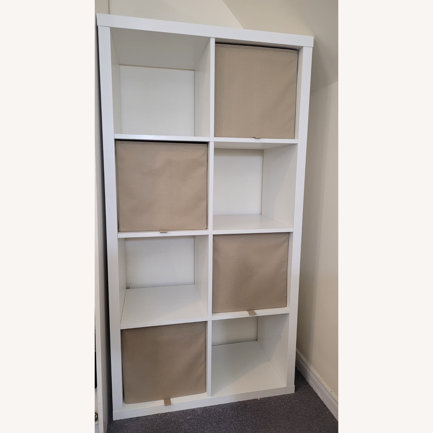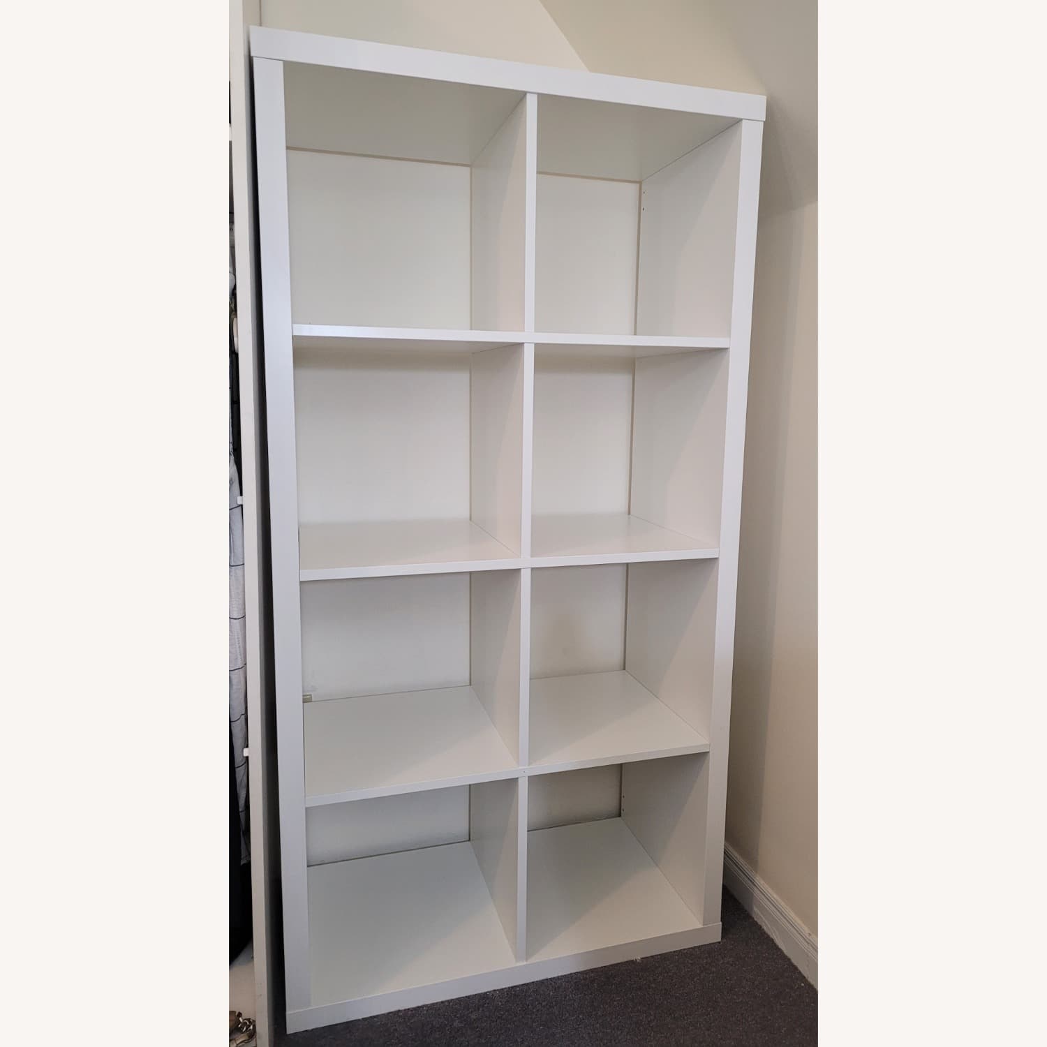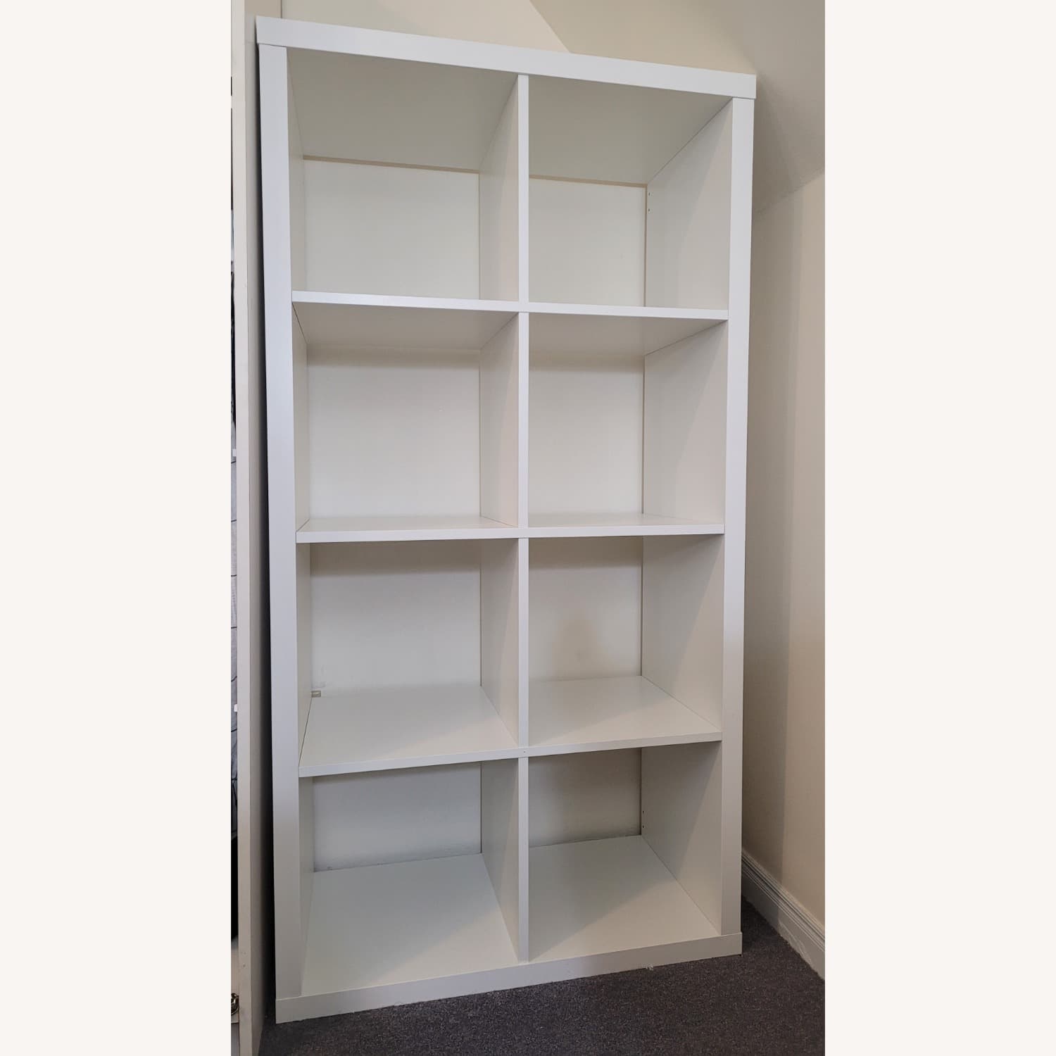 White wall unit with multiple compartments for storage and display. Ideal for organizing books, decor, and more. Used for 1 year, this IKEA wall unit is in excellent condition.