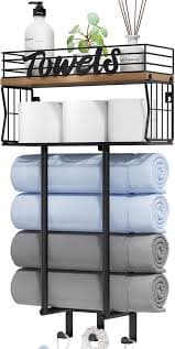 Amazon.com: HapiRm Towel Rack Wall Mounted - Bathroom Towel Holder with Metal Storage Basket, Rolled Towel Storage with Wood Shelf, Bath Towel Organizer with 3 Hooks for Small Bathroom, Black : Home & Kitchen