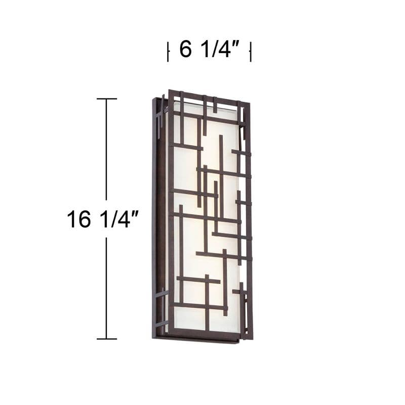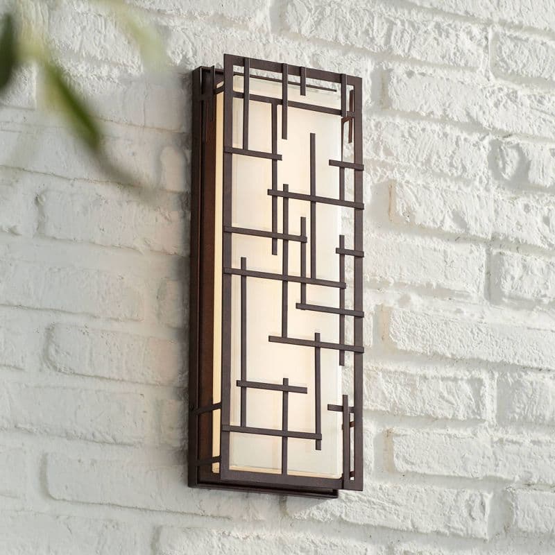 Brighten your outdoor porch or patio space with this low profile LED outdoor wall light. The large ADA compliant design features a bronze finish frame with modern lines over white cased glass. The glass is an even diffuser for the dimmable, energy-efficient LED light source within.