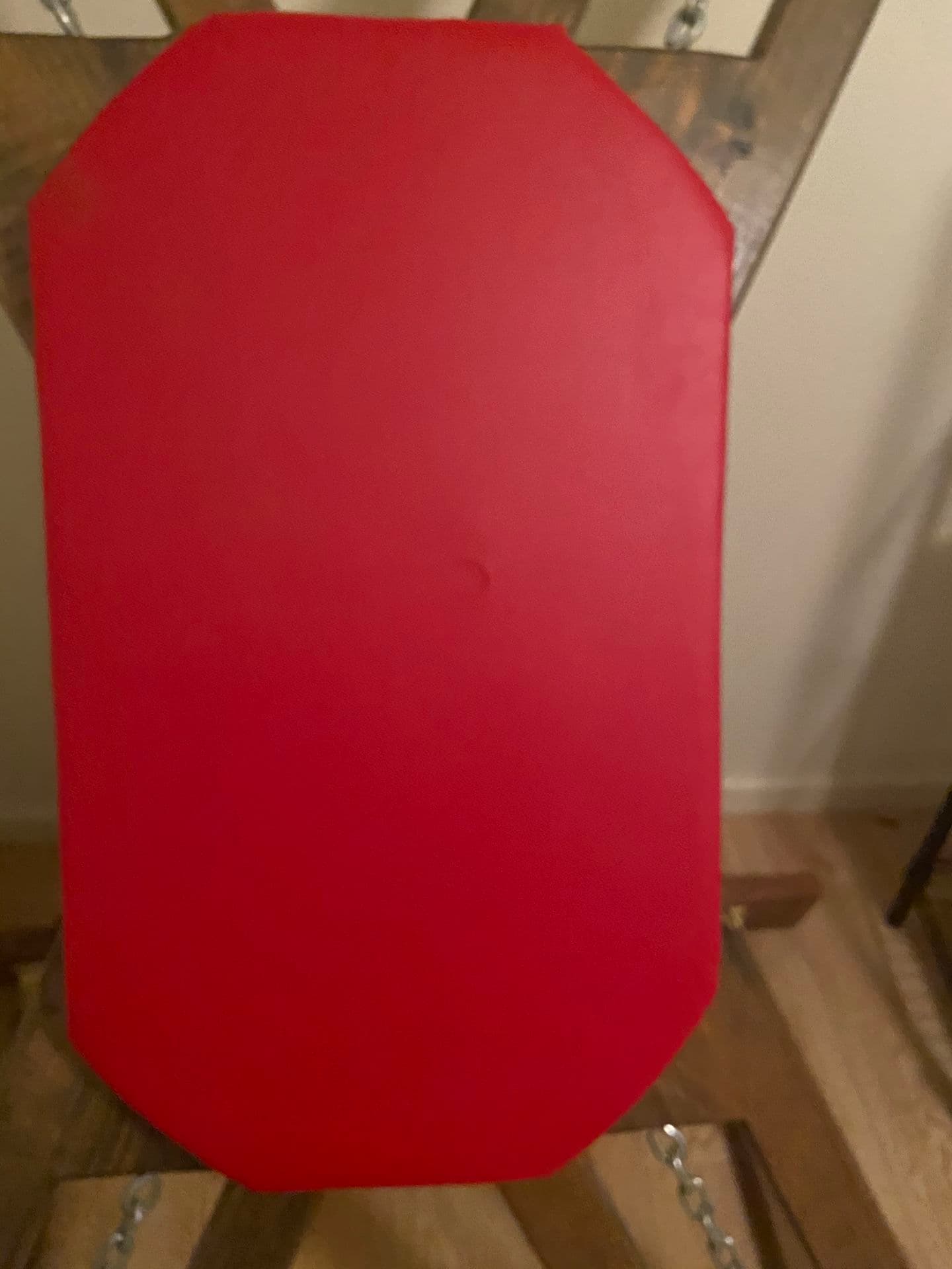 Sturdy wood and metal. Folds for easy storage, just remove screws in back hinge. Small dent/cut in upholstery that doesn’t affect usability.
