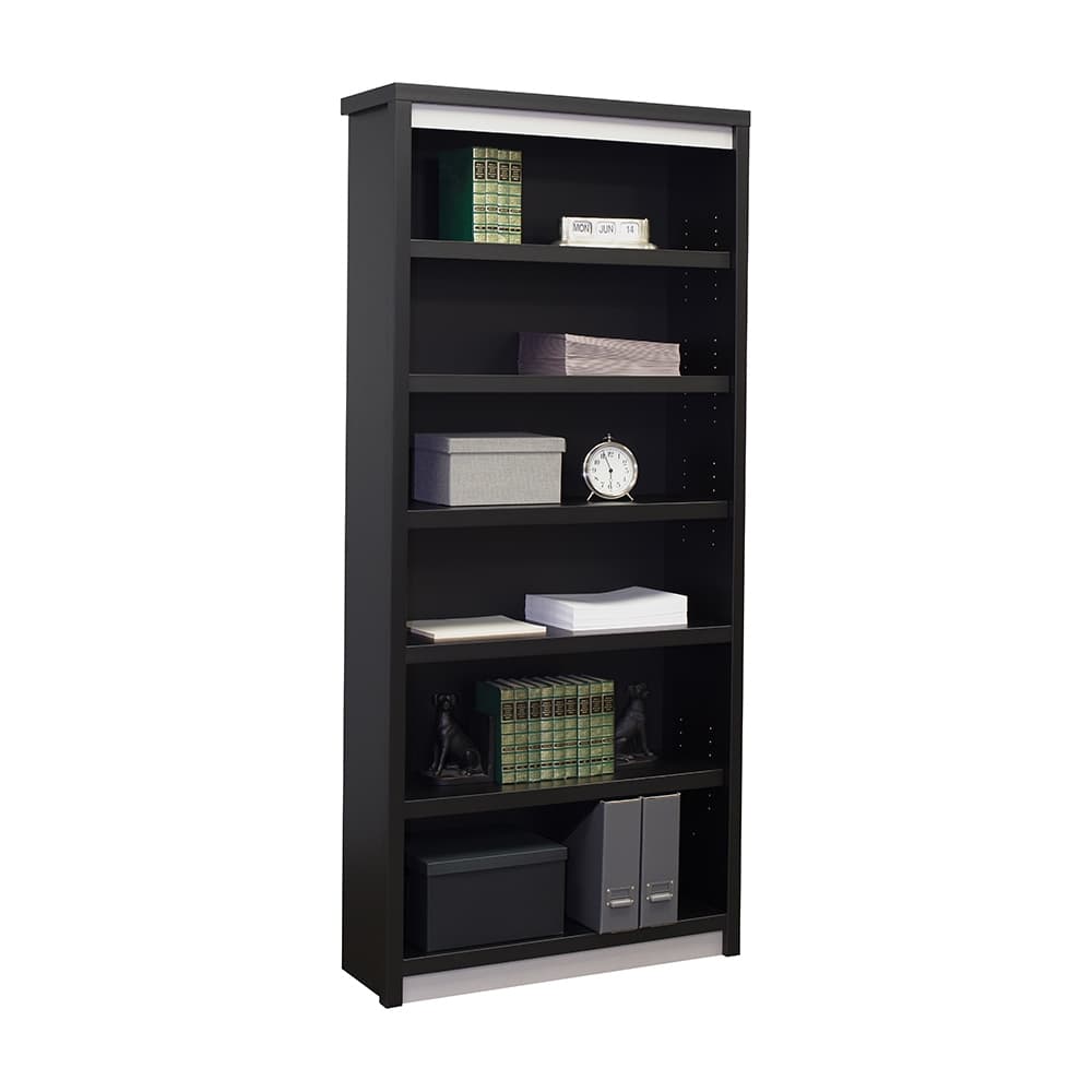 Store books and resources beautifully in your work area with the Metropolitan open bookcase. With its silver base and top trim the bookcase adds a contemporary style to any office or work area. Four adjustable shelves and two permanent shelves ensure plenty of room. Create the shelf heights you need for your binders, books, decorative accents and more. This bookcase has an unfinished back, and is meant to be put up against a wall. This bookcase has a laminate finish with silver accents.From benched workstations to private office, open spaces to conference rooms, Metropolitan will outfit your facility with an updated, contemporary look.Fully assembled. Wood comes from sustainable forests.