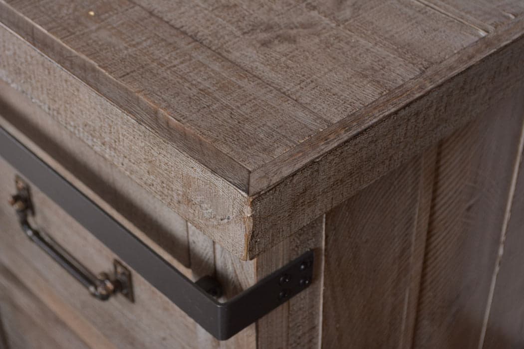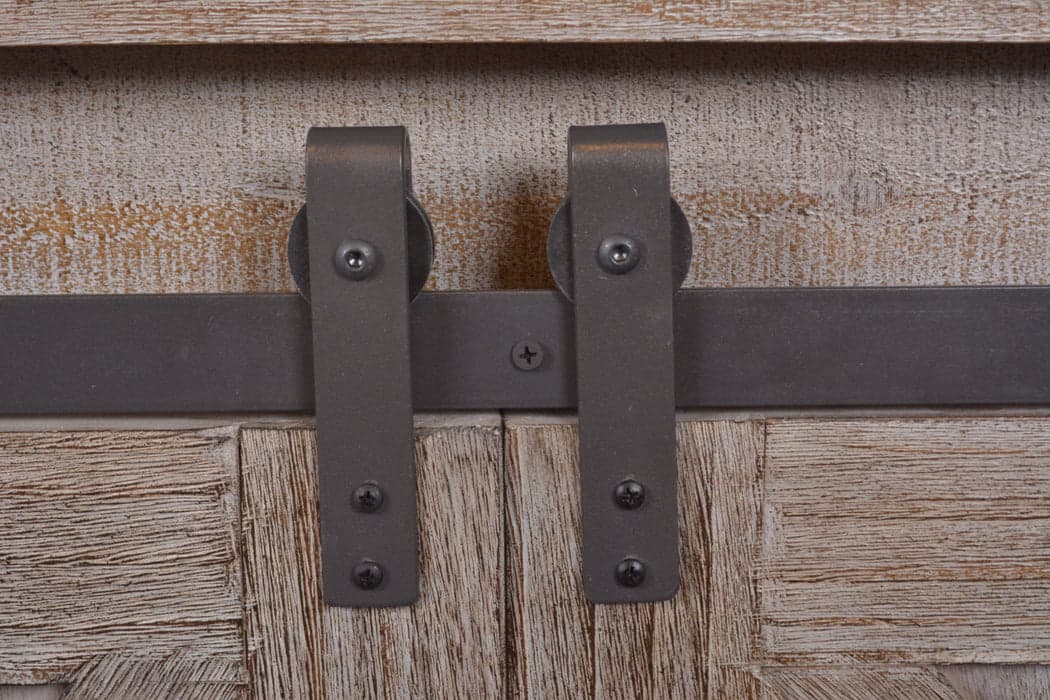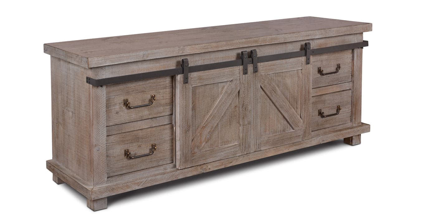 Westgate Collection: A collection of farmhouse industrial furniture with solid wood, distressed paint, metal hardware and sliding doors. Solid pine wood, Four drawers on smooth metal drawer slides, Doors slide fully along the upper rail, Openings have been made for your cables to come through the back, No Assembly Required.