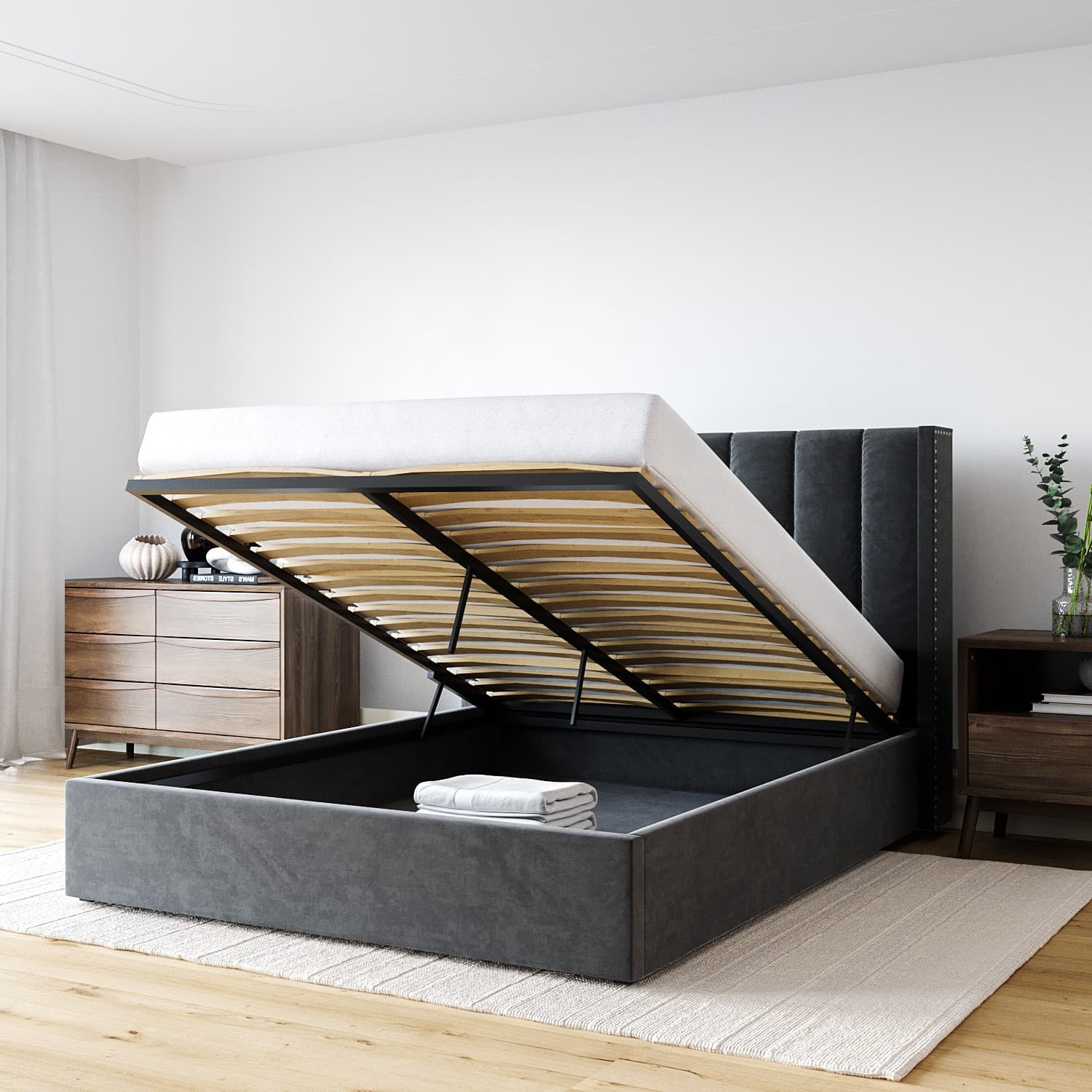 The stunning Maddox Ottoman bed frame has it all; style, comfort and storage. Upholstered in a soft grey velvet fabric, it is easy to coordinate with other furniture pieces and fits perfectly into any modern bedroom scheme. The padded winged headboard is sumptuously cushioned and finished with a stylish studded trim. The front-opening gas-lift mechanism allows you to access the generous fabric-lined storage space with ease. The bed features a durable wooden frame, with a sturdy wooden sprung-slatted base, supported by central legs for extra stability.