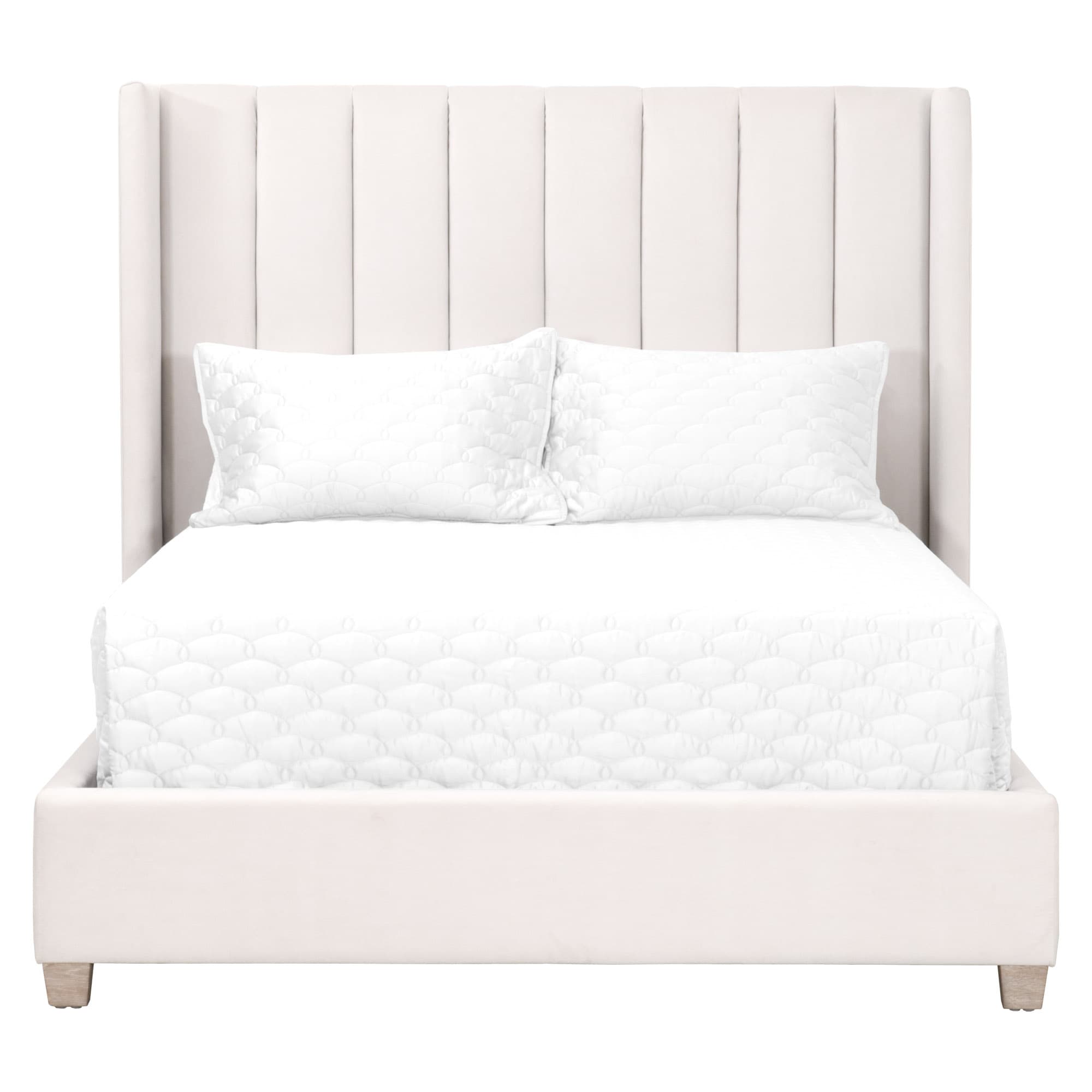 Elevate your bedroom with the sophisticated charm of this bed. This transitional piece features an upholstered frame with a gorgeous cream-colored velvet and exposed solid oak feet with a natural gray finish. These neutral and light tones create an inviting and airy atmosphere for rest and relaxation. Measuring 87.25" wide, 87" deep, and 61.75" high, this will support a standard king mattress. This bed is designed with an elegant wing headboard, accented by vertical channel stitching and edge piping detail. The removable metal frame European slat system ensures stability and can work with a box spring. Bring a touch of refined elegance to your space with this exquisite bed.