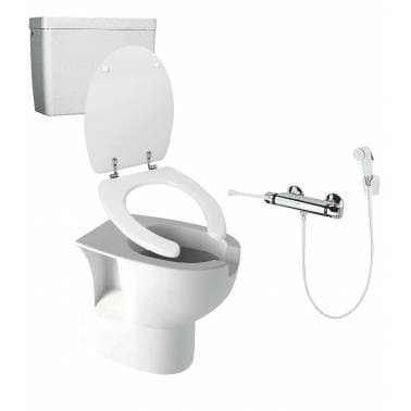 Kit inodoro ergónomico con salida a suelo, cisterna, asiento y mezclador termostático Nofer