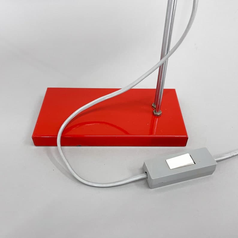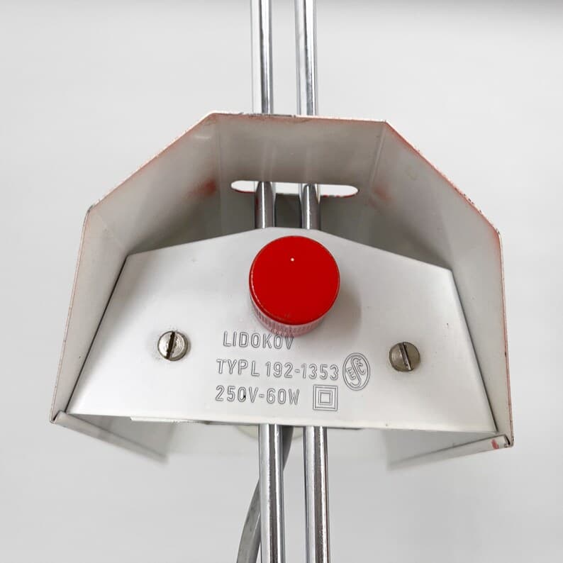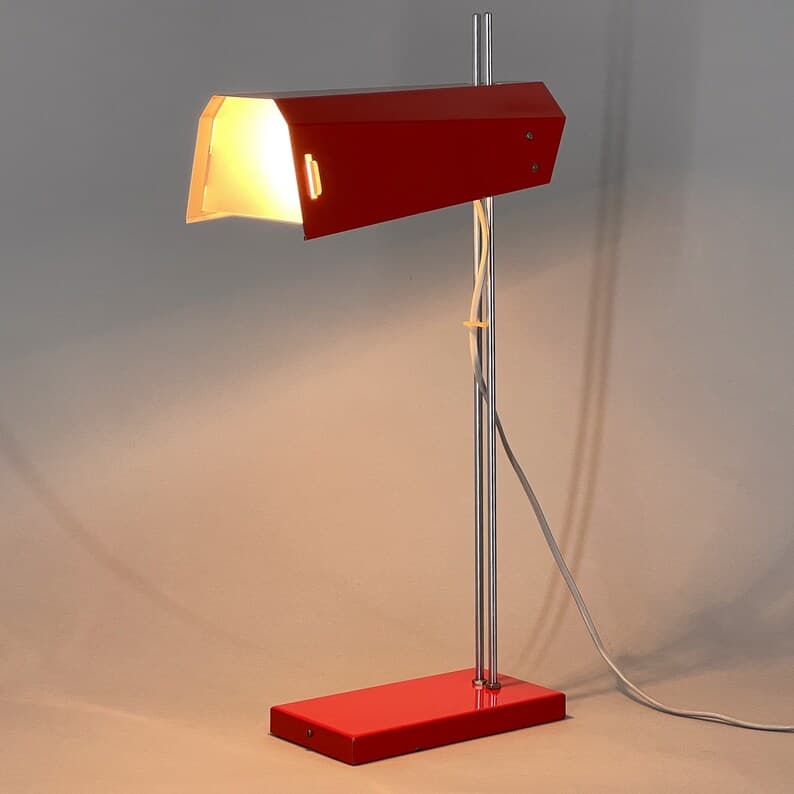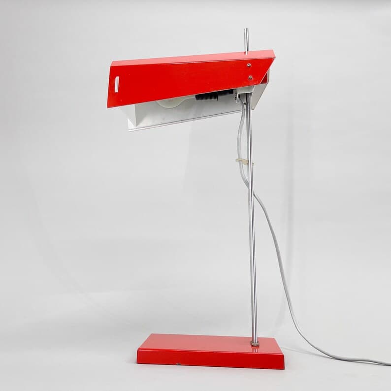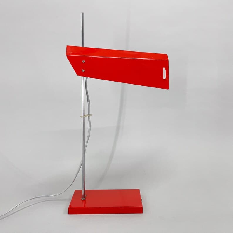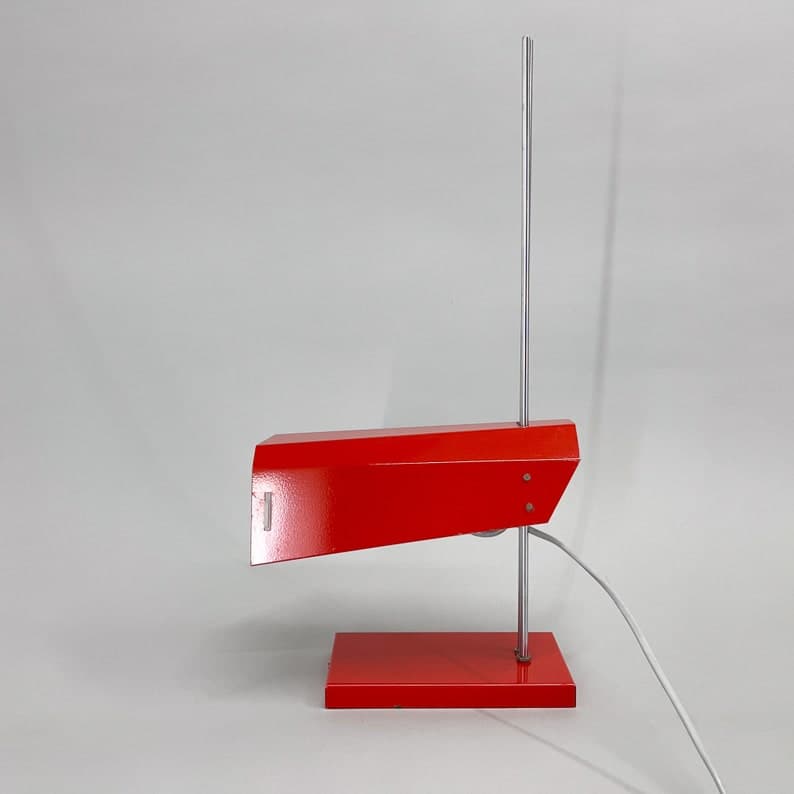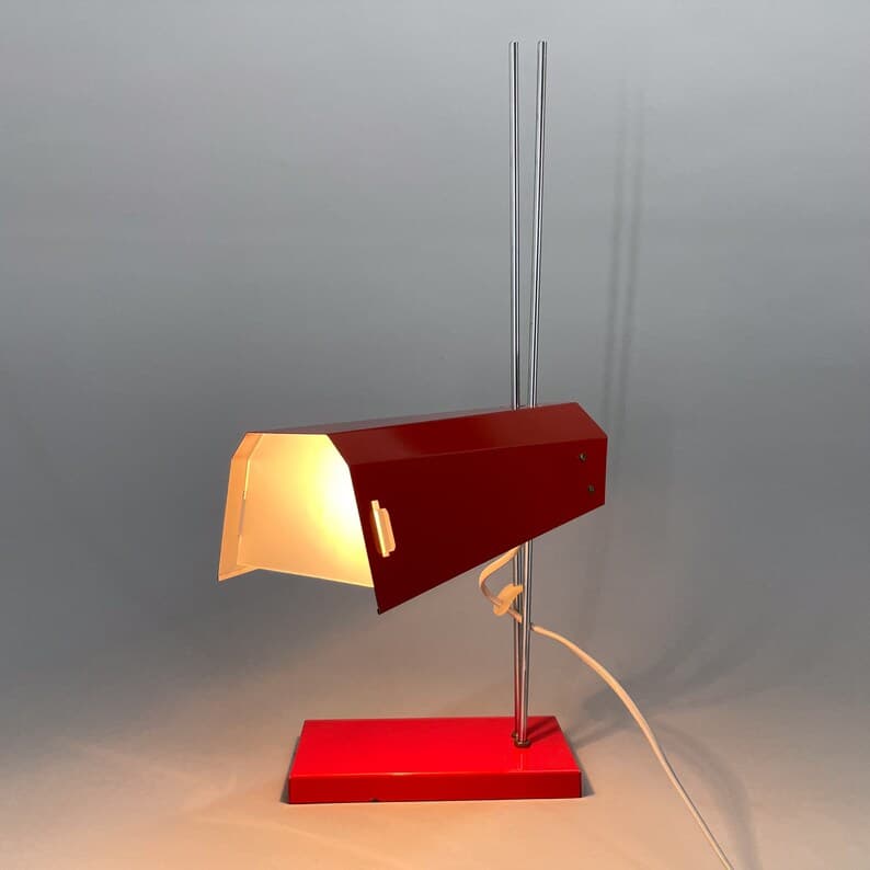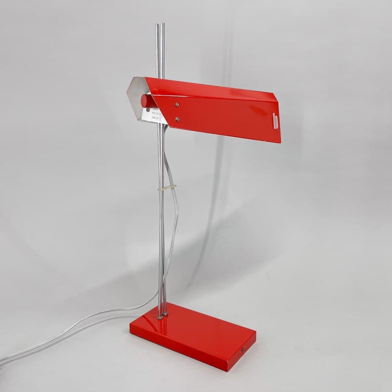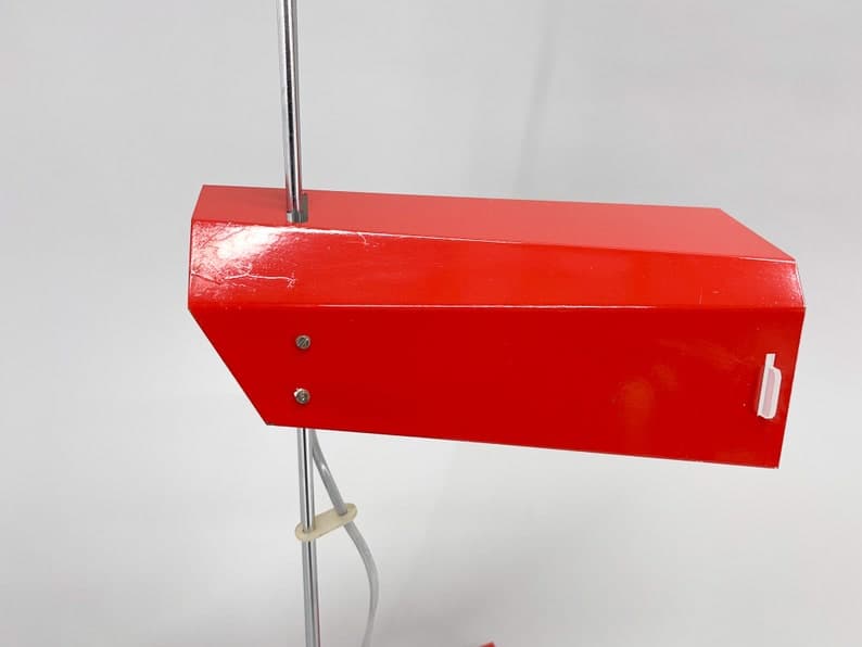 Vintage red metal and chrome table or desk lamp with adjustable lamp shade height. Type L 192 -1353 produced by Lidokov in former Czechoslovakia in the 1970's. US adapter included. Bulb: 1x E26-E27.