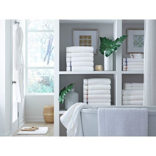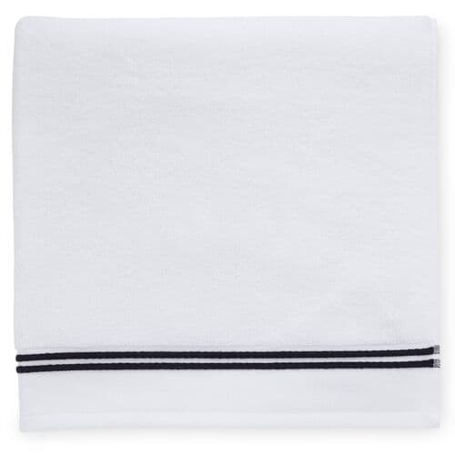This hand towel is made in Portugal from plush, combed cotton terry with a honeycomb dobby border and two rows of contrasting embroidery. The soft and absorbent towel is perfect for daily use. It features a simple yet elegant design, making it suitable for any home decor. The towel is made from high-quality materials, ensuring durability and comfort.