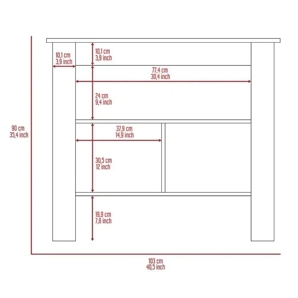 The Home Kitchen Island seamlessly blends functionality and style with its elegant white base and warm walnut finished top. Offering ample workspace on the spacious tabletop, it also boasts abundant storage with two side shelves and a split bottom shelf to keep essentials organized. One side is designed as a cozy workstation, providing legroom for comfortable meal prep. This versatile piece serves multiple purposes - extra counter space, storage, and a dedicated prep area. The two-tone finish adds a sophisticated touch to any kitchen décor. Measuring 35.4"H x 40.5"W x 27.5"D, it's sized perfectly for most kitchens, maximizing utility without overwhelming the space.