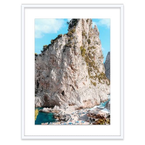 Natalie Obradovich's photography transports viewers to a picturesque southern Italy coast. This piece, printed on quality photo paper, is floated over a white mat and encased in a pine frame, ready for display. The photographer, based in New York and Los Angeles, draws inspiration from her interior design work and travels, capturing oceanic beauty.