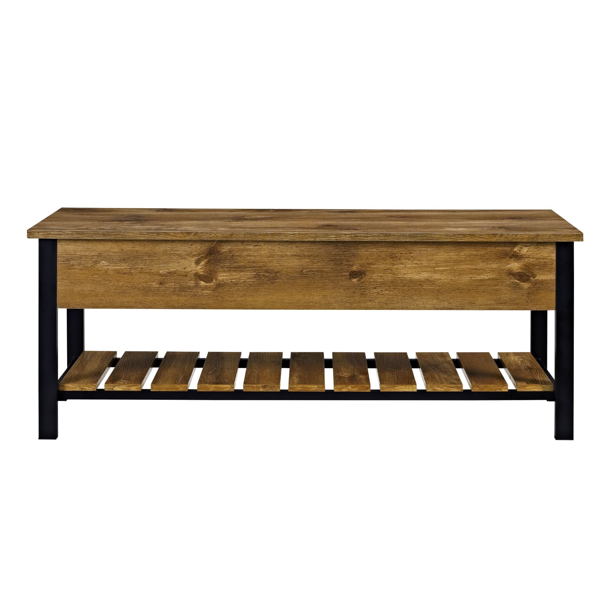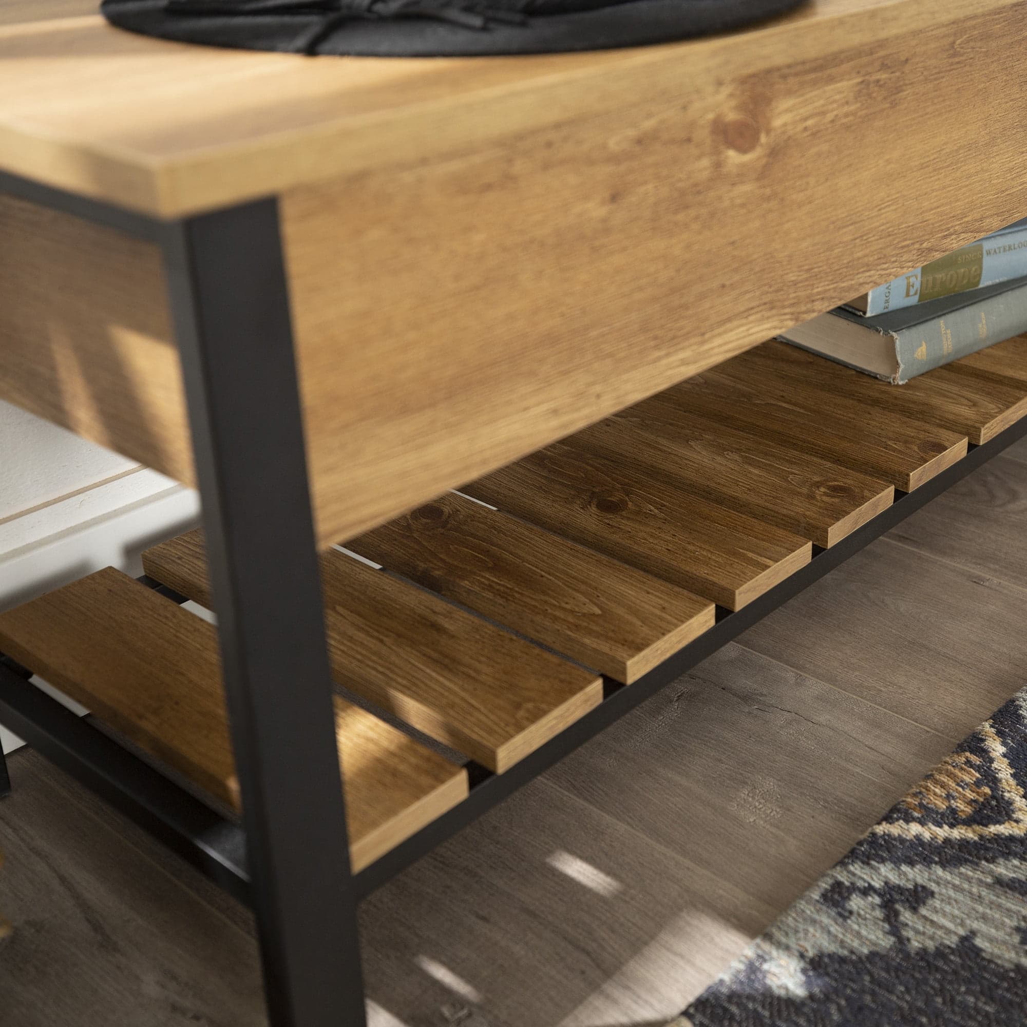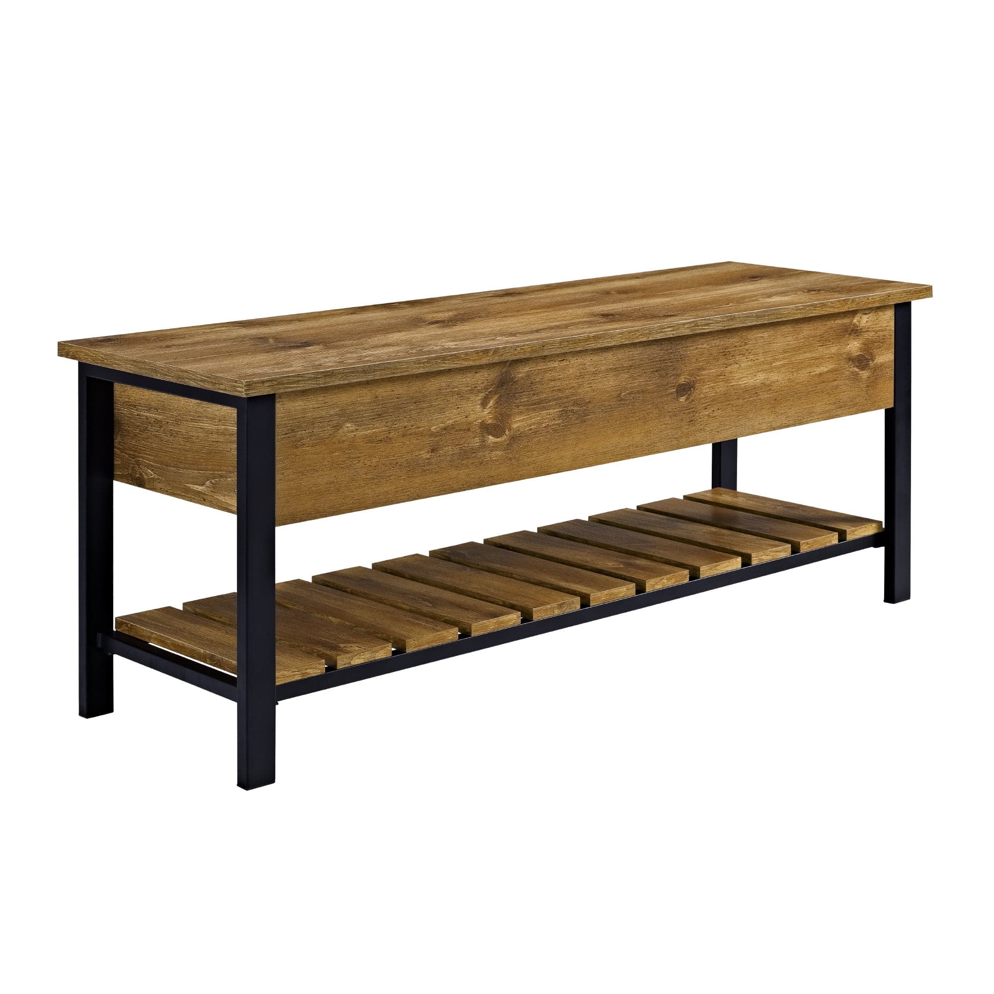 This bench is both beautiful and functional, providing ample storage and a touch of modern farmhouse style for your home’s entryway or hallway. The natural-looking wood finish made of warp-resistant MDF and powder coated metal give it a unique rustic design that's sure to complement a variety of home décor. The open top storage space as well as the bottom slatted shelf are the perfect place for your shoes and accessories that you’ll need when you're headed out the door.