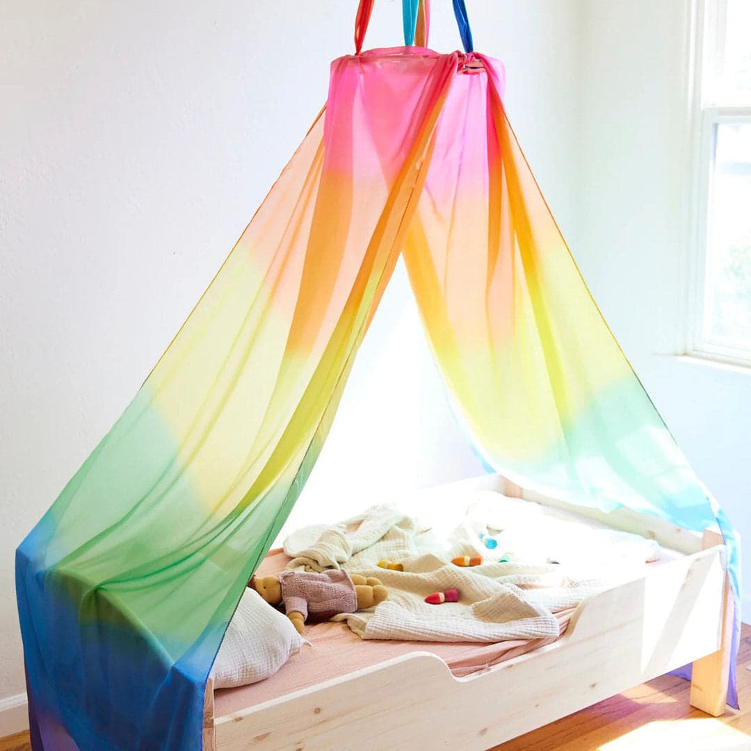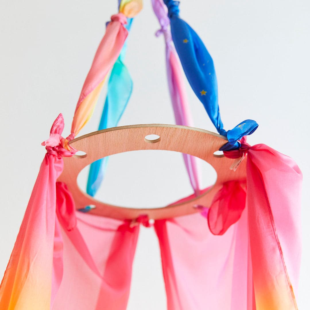 Our Canopy Ring is the perfect fort building tool! Tie Playsilks through the holes and enjoy a beautiful play space. It also may be used as a canopy ring! Tie Giants or Double Playsilks through the ring holes and hang over your child's bed to create a cozy, beautiful canopy. 8 softly sanded holes, 1/2" diameter Measures.