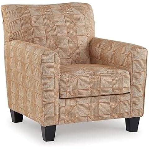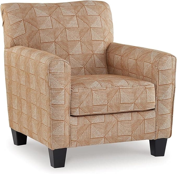 Spruce up your contemporary living space with our Heena accent armchair. It features a brown geometric pattern print against tan polyester upholstery, adding a touch of personality without overwhelming the space. The soft cushioning and attached seat cushion ensure comfort, while the tapered legs and black metal frame add a touch of modern sophistication.