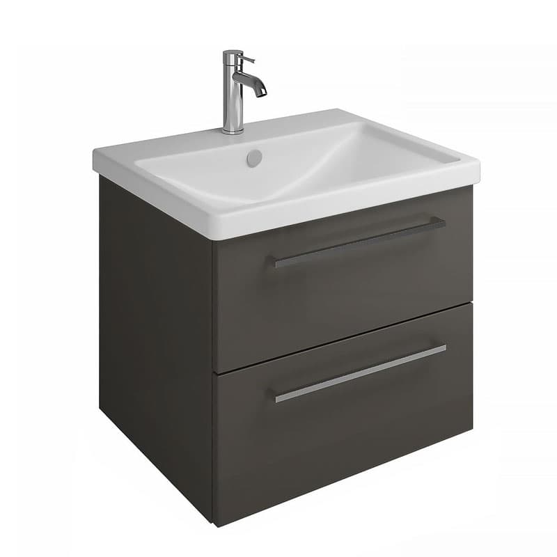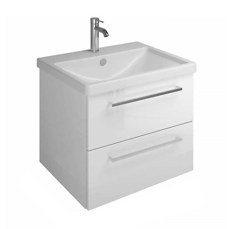 Set bestehend aus Keramik-Waschtisch, 630 x 45 x 490 mm, Beckenmaß 570x340 mm, Muldentiefe 130 mm, Waschtischfarbe Weiß Nr. C0001, Waschtischunterschrank, 600 x 480 x 480 mm mit 1x Schublade oben mit Siphonausschnitt, 1x Auszug unten, Griff chrom, Griffausrichtung: horizontal mittig