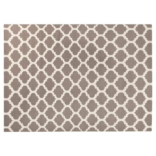 Handwoven wool flat-weave displays a traditional Moroccan trellis pattern in a modern color scheme. Reversible for easy style changes. A rug pad is advised to secure it in place.