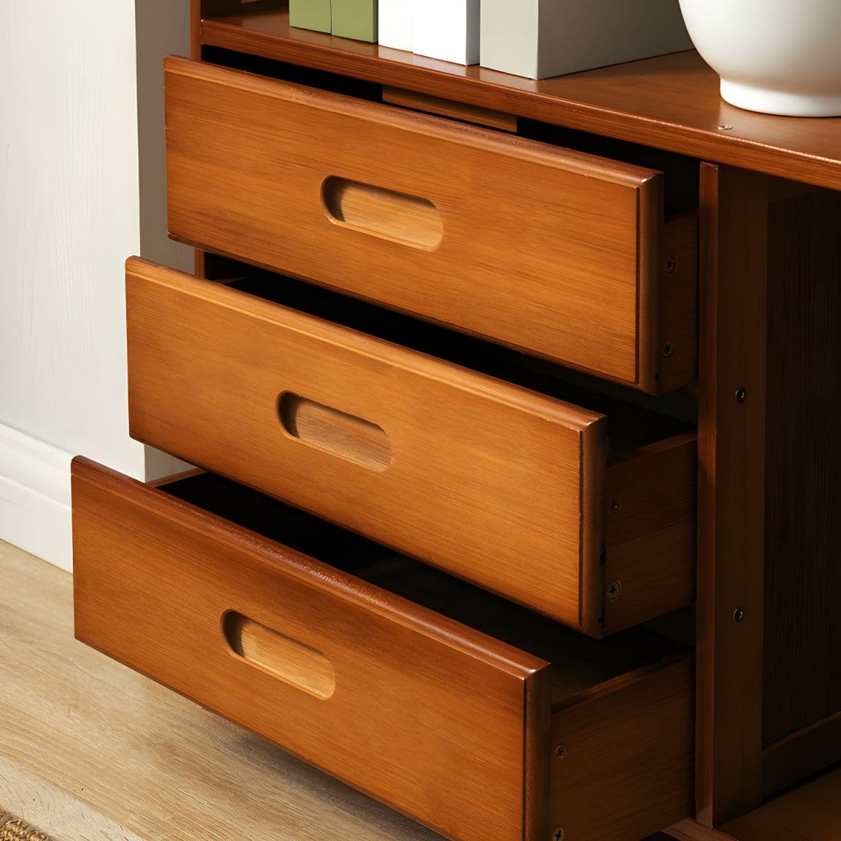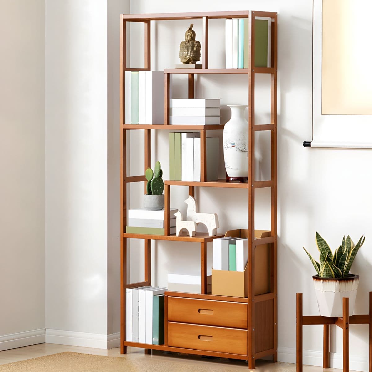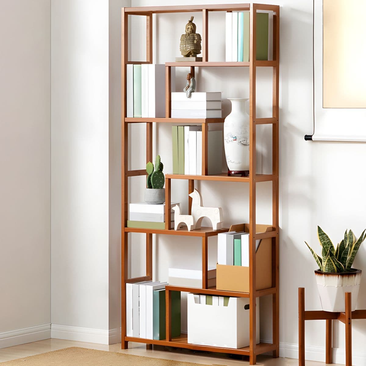 This Etagere bookcase combines functionality and elegance, providing ample storage space with a modern design. Made from bamboo, it features multiple shelves for displaying books and decorative items.