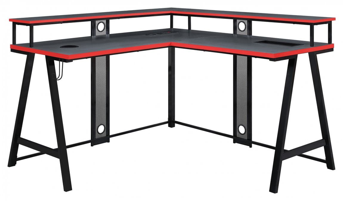 The l shaped desk gaming has a raised monitor shelf and RBG LED lights with a remote control that allows for color and pulse lighting options. The steel frame has a Black powder coated finish and the laminate top has a Carbon Fiber finish with a Red accent. It also has a USB/Power charging hub and it's backed by a 3-year manufacturer's warranty.