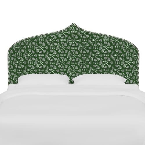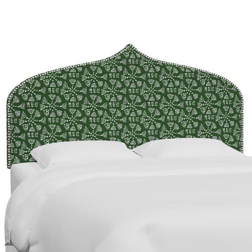 Inspired by Mughal architecture, the headboard's silhouette features nailhead trim. The linen upholstery includes a floral motif reminiscent of Indian block prints. Made in the USA, it attaches easily to standard bed frames.