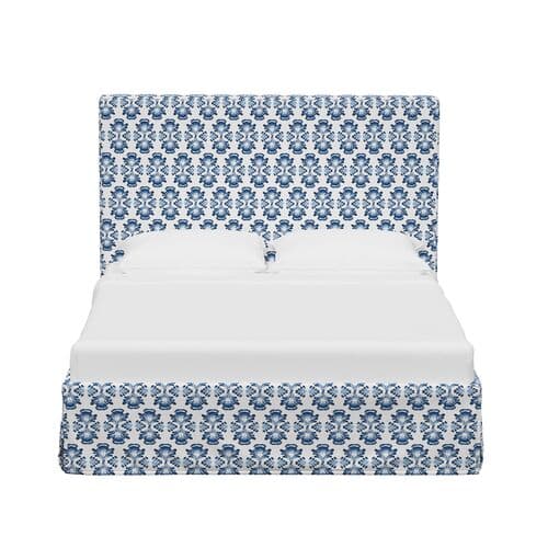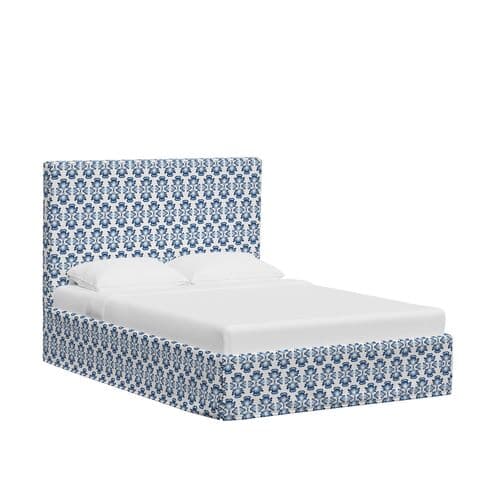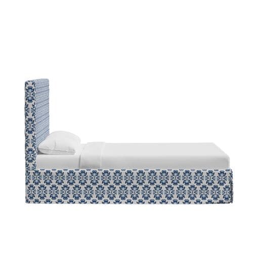 The floral design on the upholstery is inspired by Indian block prints, adding timeless elegance to the bed's minimalist lines. Made in the USA, this bed features a long tailored skirt and a tall padded headboard, perfect for lounging with a book or watching TV.