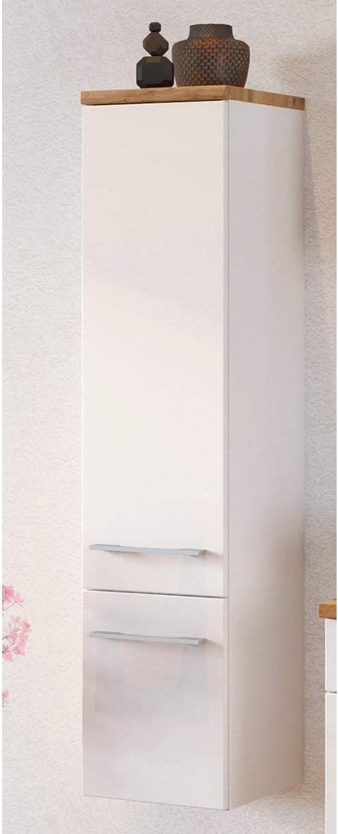 Product dimensions: width 30 cm, height 130 cm, depth 35 cm, material: body: chipboard melamine resin coated, front/cover plate: medium density fibreboard (MDF) foiled, handles: aluminium, colour: body: white, front: white matt, cover plate: Wotan oak replica, handles: aluminium colours, product details: modern midi cabinet, made in Germany, 2 wooden doors, 1 construction base, 4 inserts. The height-adjustable dampened hinges. Delivered disassembled including easy-to-follow assembly instructions (English language not guaranteed). Decoration and accessories not included.